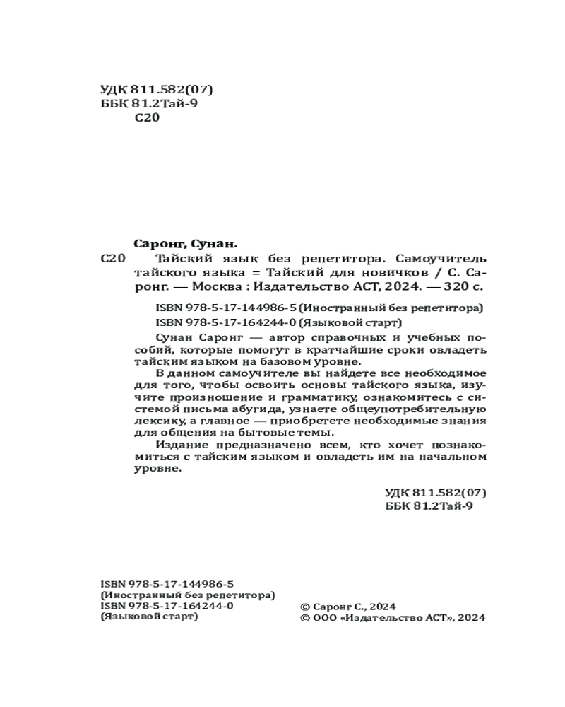 💳 Оплатить за товар можно при получении 🇰🇿 Есть бесплатная доставка по Казахстану от 1 дня 🎁 Копите бонусы с каждой покупки Серия: Языковой старт Сунан Саронг — автор справочных и учебных пособий, которые помогут в кратчайшие сроки овладеть тайским языком на базовом уровне. В данном самоучителе вы найдете все необходимое для того, чтобы освоить основы тайского языка: изучите произношение и грамматику, ознакомитесь с системой письма, узнаете общеупотребительную лексику, а главное — приобретете необходимые знания для общения на бытовые темы. Издание предназначено всем, кто хочет познакомиться с тайским языком и овладеть им на начальном уровне. |
