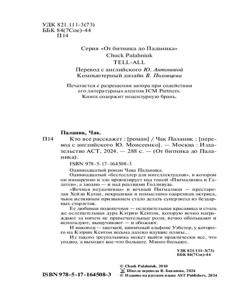 💳 Оплатить за товар можно при получении 🇰🇿 Есть бесплатная доставка по Казахстану от 1 дня 🎁 Копите бонусы с каждой покупки Серия: От битника до Паланика Одиннадцатый роман Чака Паланика. Одиннадцатый «бестселлер для интеллектуалов», в котором он изощренно и зло иронизирует над темой «Пигмалиона и Галатеи», а заодно — и над реалиями Голливуда. |