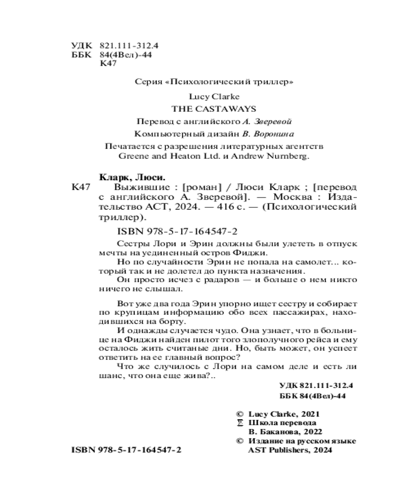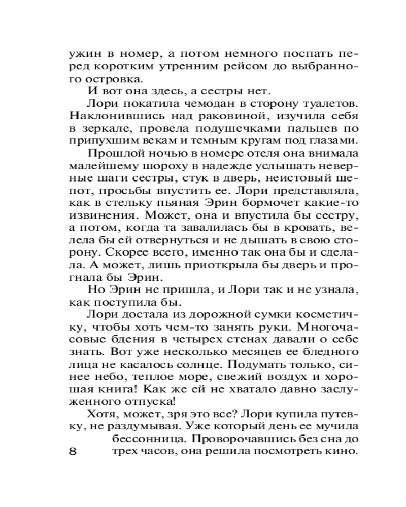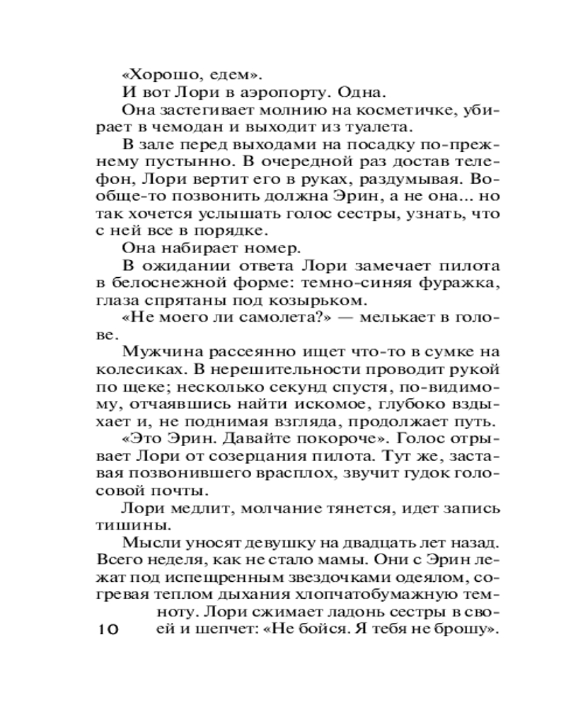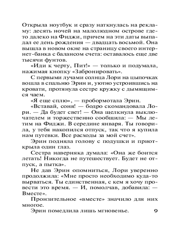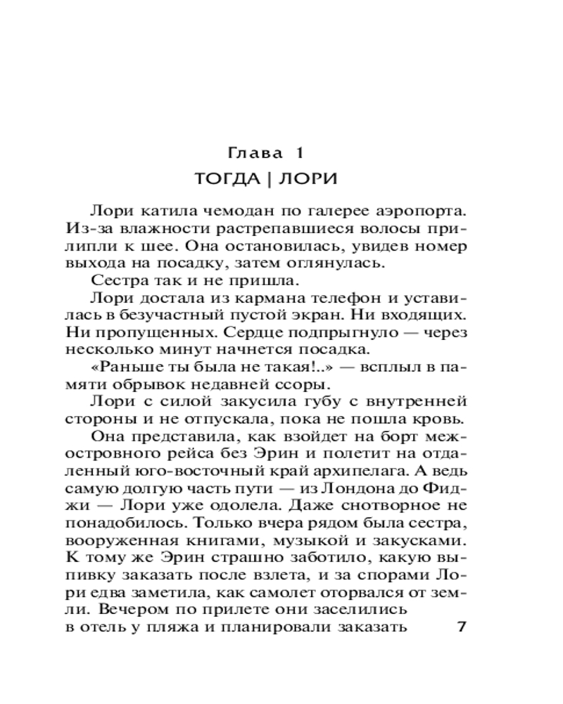 💳 Оплатить за товар можно при получении 🇰🇿 Есть бесплатная доставка по Казахстану от 1 дня 🎁 Копите бонусы с каждой покупки Серия: Психологический триллер (м) Сестры Лори и Эрин должны были улететь в отпуск мечты на уединенный остров Фиджи. Но по случайности Эрин не попала на самолет... который так и не долетел до пункта назначения. Он просто исчез с радаров — и больше о нем никто ничего не слышал. Вот уже два года Эрин упорно ищет сестру и собирает по крупицам информацию обо всех пассажирах, находившихся на борту. И однажды случается чудо. Она узнает, что в больнице на Фиджи найден пилот того злополучного рейса и ему осталось жить считанные дни. Но, быть может, он успеет ответить на ее главный вопрос? Что же случилось с Лори на самом деле и есть ли шанс, что она еще жива?.. |
