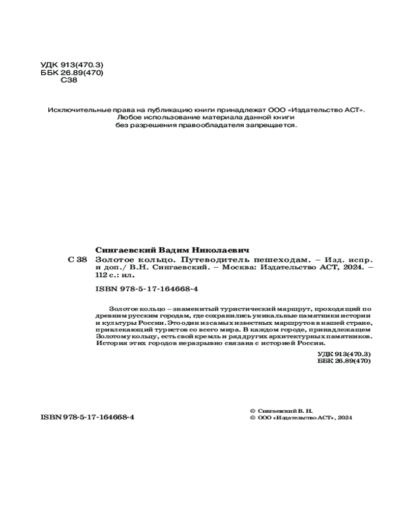 💳 Оплатить за товар можно при получении 🇰🇿 Есть бесплатная доставка по Казахстану от 1 дня 🎁 Копите бонусы с каждой покупки Серия: Путеводитель пешеходам Золотое кольцо — знаменитый туристический маршрут, проходящий по древним русским городам, где сохранились уникальные памятники истории и культуры России. Это один из самых известных маршрутов в нашей стране, привлекающий туристов со всего мира. В каждом городе, принадлежащем Золотому кольцу, есть свой кремль и ряд других архитектурных памятников. История этих городов неразрывно связана с историей России. |