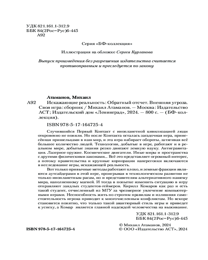 💳 Оплатить за товар можно при получении 🇰🇿 Есть бесплатная доставка по Казахстану от 1 дня 🎁 Копите бонусы с каждой покупки Серия: Коллекция Случившийся Первый Контакт с инопланетной цивилизацией люди откровенно не поняли. Но после Контакта осталась загадочная игра, принесённая пришельцами в наш мир, и эта игра набирает обороты, затягивая всё большее количество людей. Технологии, добытые в игре, работают и в реальном мире, добытые знания резко двигают земную науку. Антигравитация. Лазерное оружие. Космические двигатели. Иные миры и пространства с другими физическими законами... Всё это представляет огромный интерес, а потому правительства и крупные корпорации наперегонки включаются в исследование игры, искажающей реальность. Вот только привычные методы работают плохо, и земные фракции являются аутсайдерами в этой игре, проигрывая в технологическом развитии не только инопланетным расам, но и представителям альтернативного нашему мира, наполненному магией. И тогда в попытке изменить ситуацию в игру отправляют заядлых студентов-геймеров. Кирилл Комаров как раз и есть такой студент, отчисленный из МГУ за чрезмерное увлечение компьютерными играми. Неспособность жить по строгим правилам и излишняя самостоятельность игрока приводят к многочисленным конфликтам. Но вскоре становится понятно, что только такой авантюрный стиль игры и приведет к успеху, а Комар является главной надеждой человечества на выживание. |