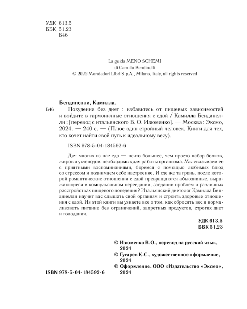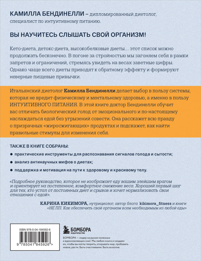 💳 Оплатить за товар можно при получении 🇰🇿 Есть бесплатная доставка по Казахстану от 1 дня 🎁 Копите бонусы с каждой покупки Серия: Плюс один стройный человек. Книги для тех, кто хочет найти свой путь к идеальному весу «Почему я не могу устоять перед этой шоколадкой? Она так и манит меня!», «Снова объелся на ночь! Почему я такой безвольный?», «Сегодня был такой сложный день, кажется, пора поднять себе настроение мороженым». Знакомые фразы? Часто ли вы корите себя за лишний кусочек пиццы, съеденный за ужином, и сокрушаетесь о том, что в этом году снова не успели подготовиться к лету? Итальянский диетолог Камилла Бендинелли расскажет вам о том, как разорвать порочный круг диет и перестать загонять себя в рамки. Она уверена, достаточно лишь научиться слушать и слышать свой организм, чтобы прийти в форму и, главное, удержать ее надолго. Без боязни сорваться и бесконечных запретов. |
