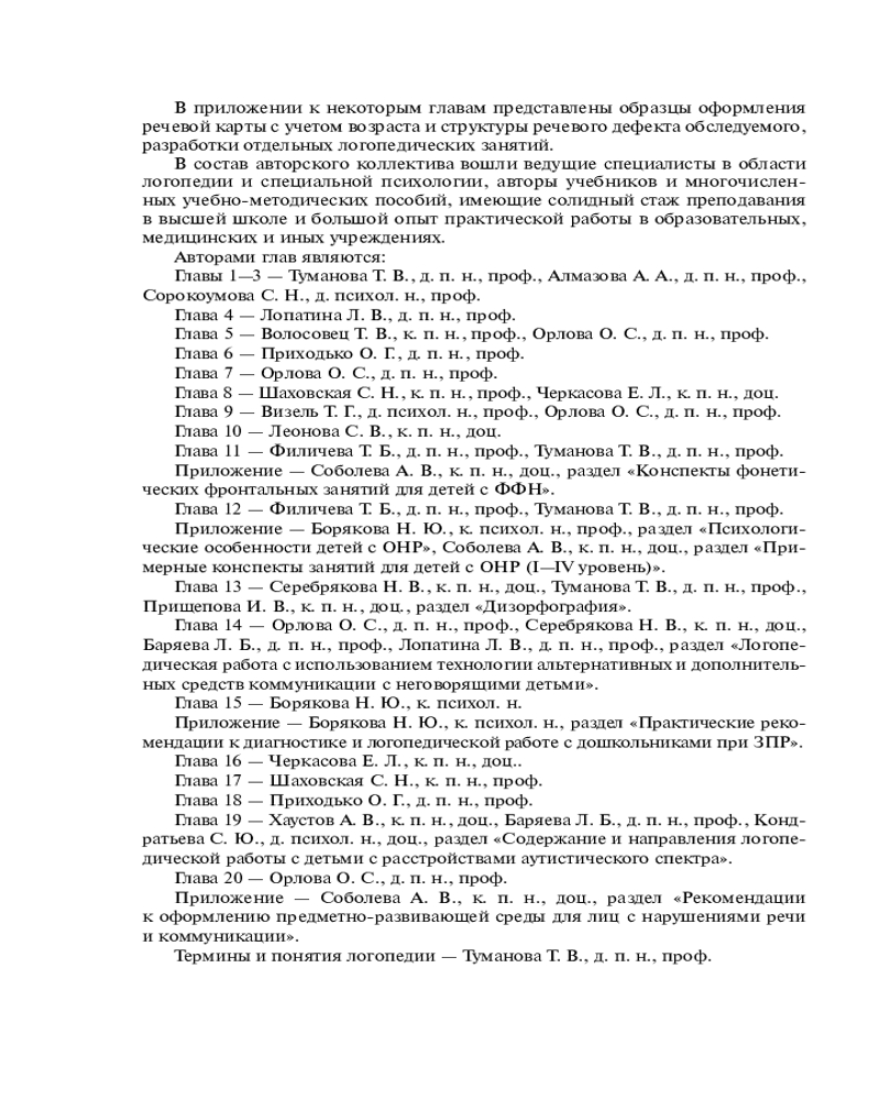 Орлова Ольга Святославовна — доктор педагогических наук, профессор, заведующая кафедрой логопедии МГГУ им. М.А. Шолохова, профессор кафедры логопедии МГПУ, главный научный сотрудник ФГУ «Научно-клинического центра оториноларингологии ФМБА России», Главный редактор журнала «Школьный логопед». Туманова Татьяна Володаровна — доктор педагогических наук, профессор кафедры логопедии МГГУ им. М.А. Шолохова, кафедры логопедии МГПУ, академик Академии медико-технических наук.