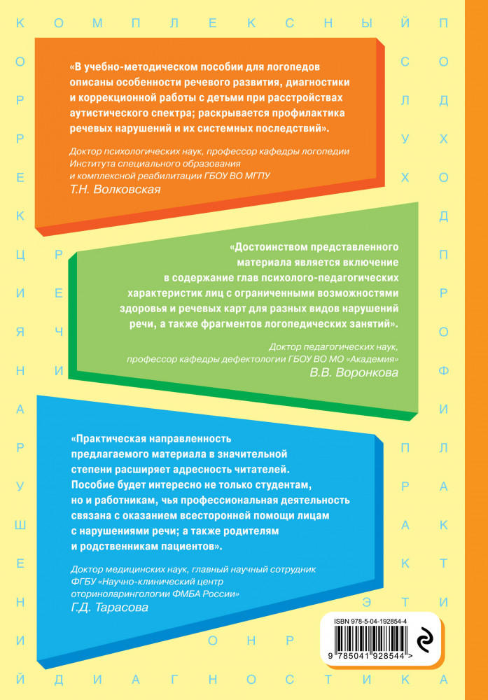 Серия: Логопед Надежда Жукова В этой книге-пособии представлена целостная, комплексная система изучения и преодоления нарушений речи в разном возрасте. Впервые в такой книге, адресованной логопедам, описаны особенности речевого развития, диагностики и коррекционной работы с детьми при расстройствах аутистического спектра, раскрывается профилактика речевых нарушений и их системных последствий.