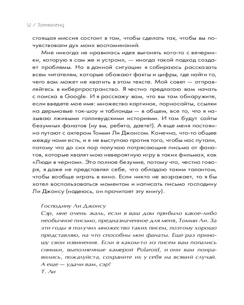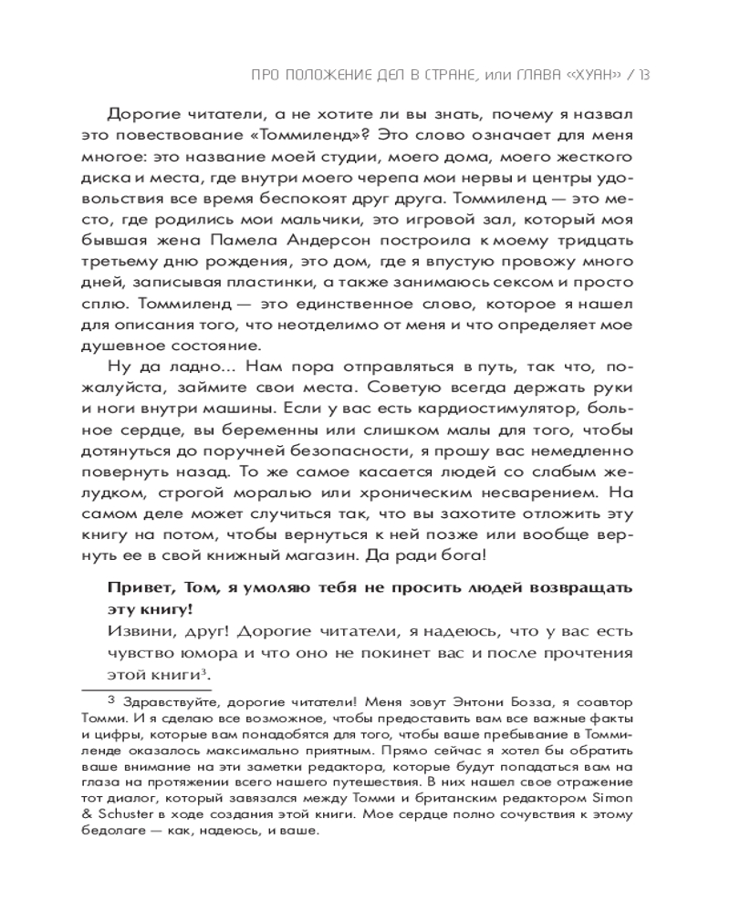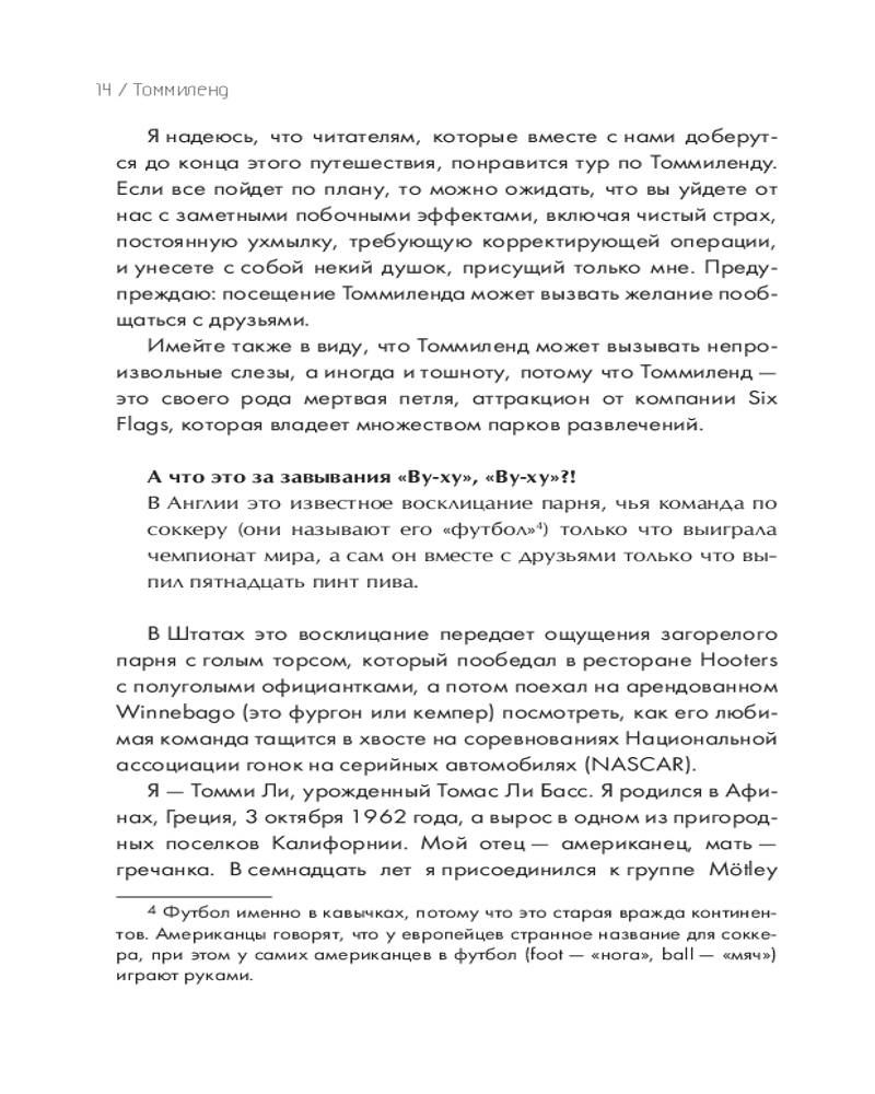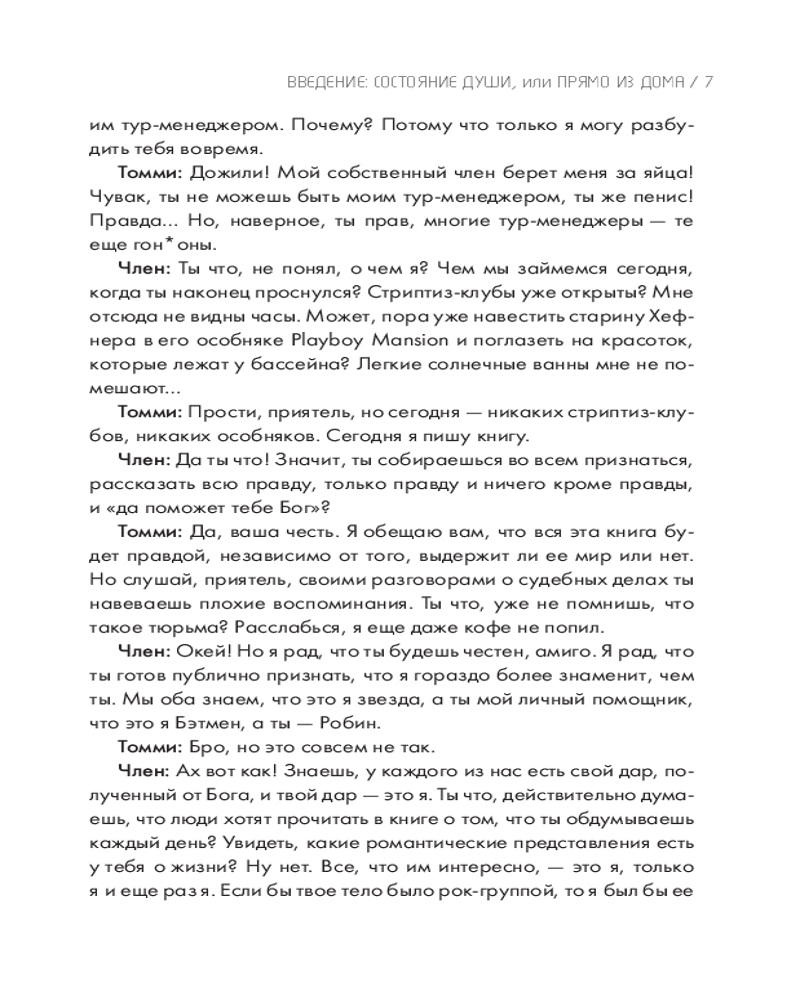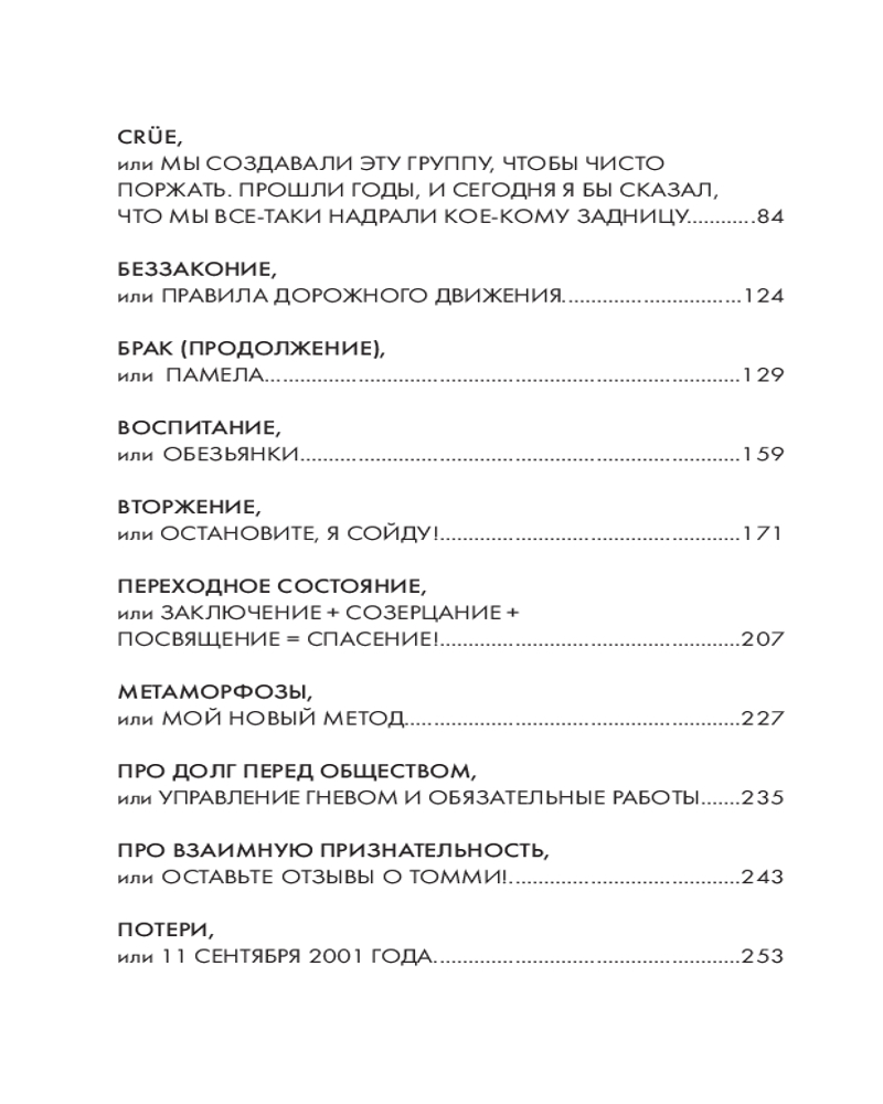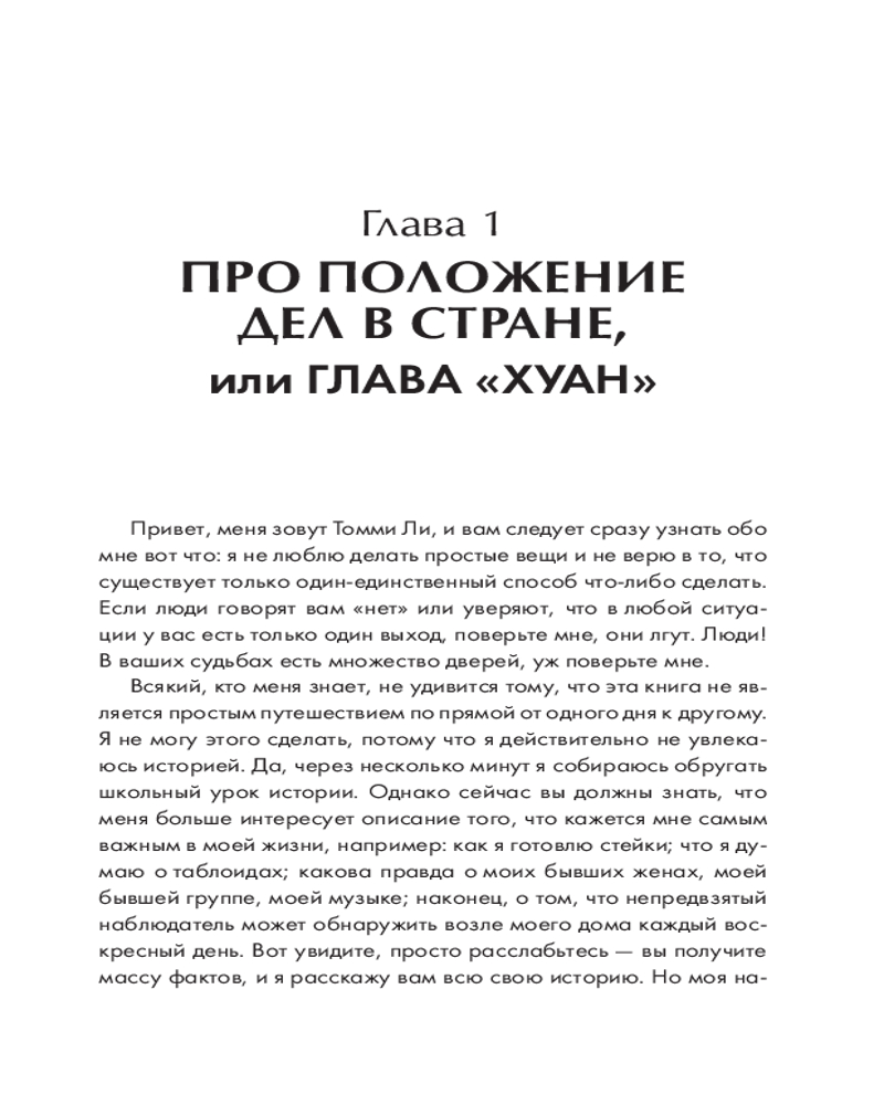 Но книга не только об этом! Это не обычная автобиография, состоящая из скучных фактов обо мне. Я хочу раскрыть и те мелочи, которые считаю самым важным в своей жизни: как я готовлю стейки, что думаю о таблоидах и своих бывших женах, как я отношусь к своей музыке и наследию Mötley Crüe. А еще открою секрет о том, чем занимаюсь каждое воскресенье. Я расскажу вам и факты, но моя главная миссия — нарисовать картину всей моей жизни. Я хочу показать, чем пахнут мои воспоминания, какого они цвета и какие на вкус. За годы драк, конфликтов, споров и судебных заседаний я усвоил одну простую вещь — у каждого своя правда. Эта книга — моя истина. Так что критика здесь не принимается. Занимайте места в автобусе, и добро пожаловать в тур! Соблюдайте технику безопасности и внимательно слушайте все, что я собираюсь рассказать. Но должен предупредить: если у вас обостренное чувство морали или вы несовершеннолетний, немедленно отложите эту книгу — боюсь, нам с вами не по пути. Прошли проверку? Тогда пристегивайтесь, мы стартуем. |