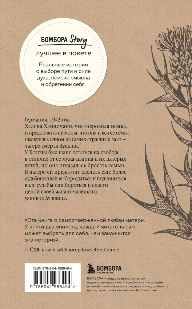 💳 Оплатить за товар можно при получении 🇰🇿 Есть бесплатная доставка по Казахстану от 1 дня 🎁 Копите бонусы с каждой покупки Серия: Бомбора Story. Лучшее в покете Книга для поклонников книги «Выбор» Эдит Ева Эгер. Бестселлер Amazon и финалист книжной премии Empik. История отважной немецкой медсестры, которая пожертвовала всем ради семьи и яростно боролась за детей, которые стали узниками Аушвица (Освенцима). |