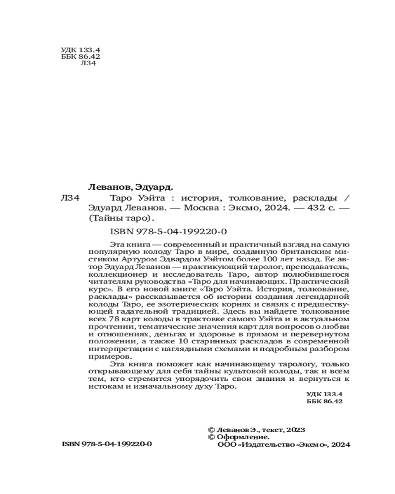 💳 Оплатить за товар можно при получении 🇰🇿 Есть бесплатная доставка по Казахстану 🎁 Копите бонусы с каждой покупки Серия: Тайны таро (обложка) Эта книга — современный и практичный взгляд на самую популярную колоду Таро в мире, созданную британским мистиком Артуром Эдвардом Уэйтом более 100 лет назад. Ее автор, Эдуард Леванов — автор полюбившихся читателям книг «Таро для начинающих. Практический курс» и «100 раскладов Таро на все случаи жизни». |