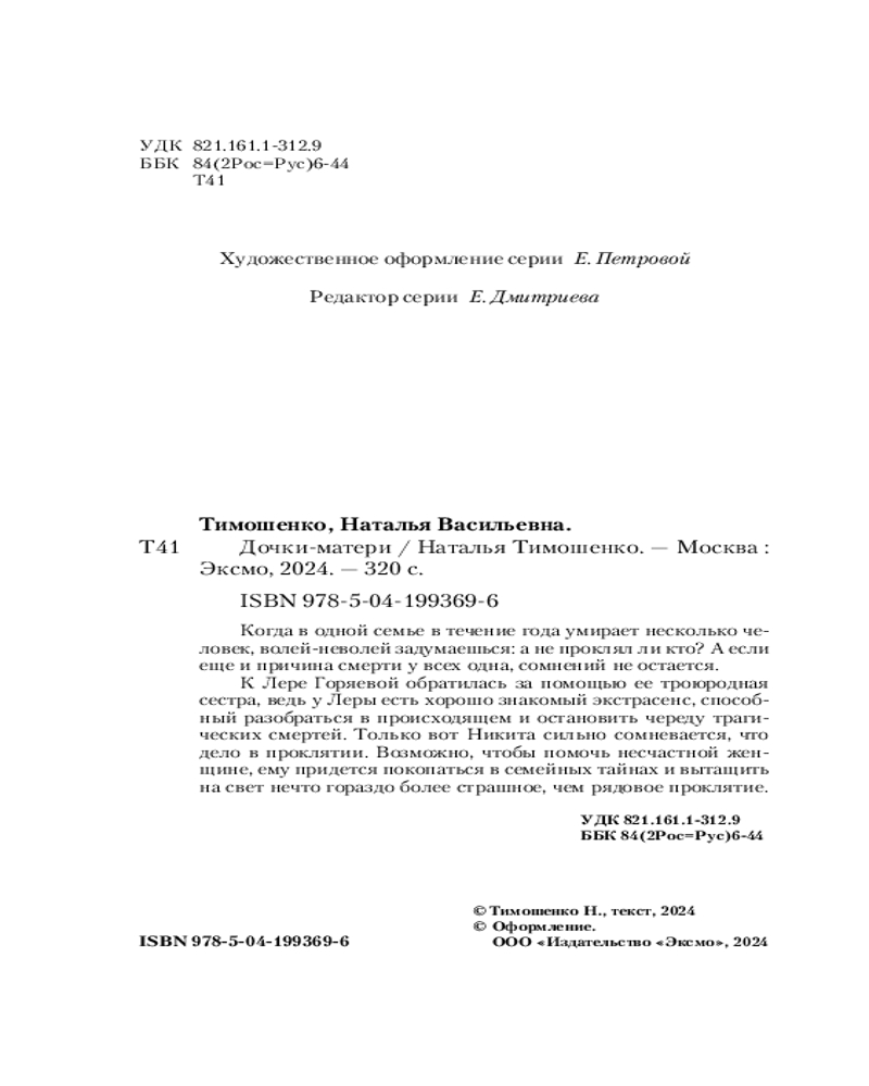 В данный момент этот товар отсутствует в продаже. Возможно, у нас найдется аналогичный или похожий товар здесь. Серия: Мистические романы Натальи Тимошенко (обложка) Захватывающее детективное фэнтези, увлекающее с первой страницы. Романы Натальи Тимошенко пропитаны мистикой и тайной. В них оживают лесные чудовища, посланники из мира мертвых и старые добрые домовые.