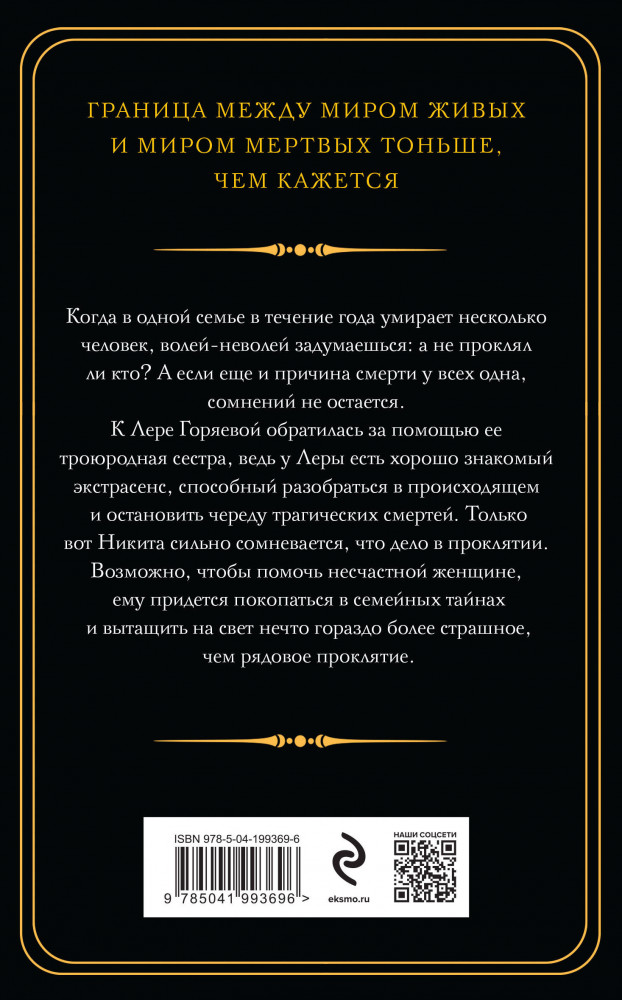 Прошлое раскрывает тайны. Когда в одной семье в течение года умирают несколько человек, волей-неволей задумаешься: а не проклял ли кто? А если еще и причина смерти у всех одна, сомнений не остается. К Лере Горяевой обратилась за помощью ее троюродная сестра, ведь у Леры есть хорошо знакомый экстрасенс, способный разобраться в происходящем и остановить череду трагических смертей. Только вот Никита сильно сомневается, что дело в проклятии. Возможно, чтобы помочь несчастной женщине, ему придется покопаться в семейных тайнах и вытащить на свет нечто гораздо более страшное, чем рядовое проклятие. |