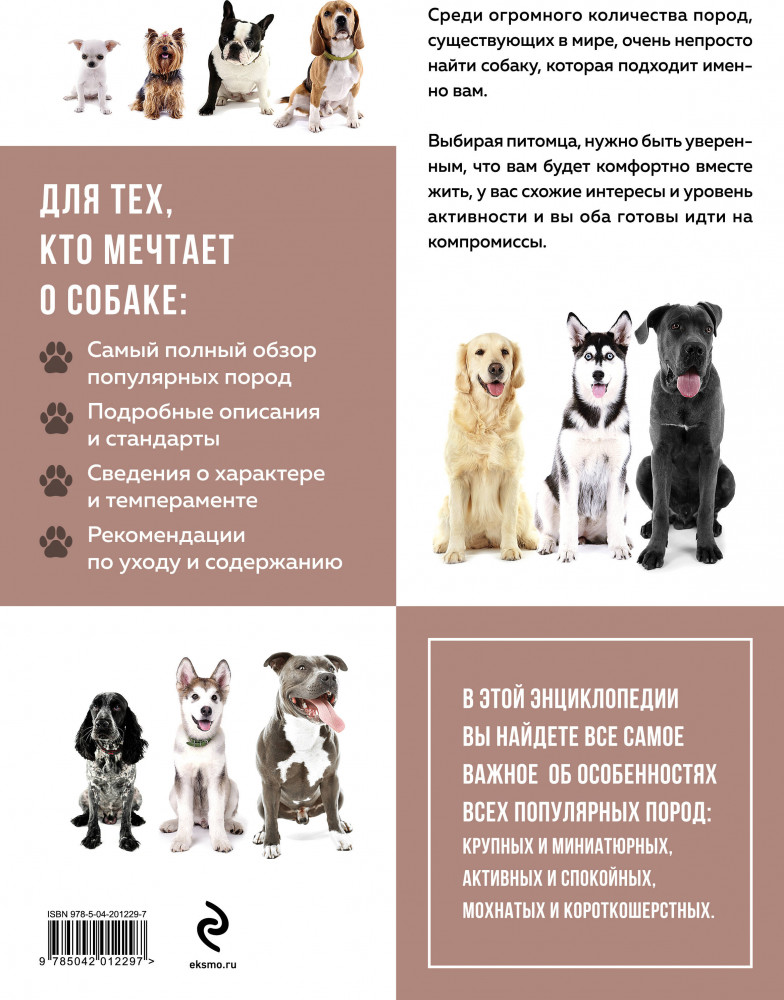 💳 Оплатить за товар можно при получении 🇰🇿 Есть бесплатная доставка по Казахстану от 1 дня 🎁 Копите бонусы с каждой покупки Серия: Подарочные издания. Домашние любимцы Выбрать именно ту собаку, которая подойдет вам по характеру, образу жизни или интересам, не так просто. Каждый щенок — милейшее создание, мимо которого сложно пройти. Но среди огромного количества пород, существующих в мире, обязательно есть та, которая будет подходить именно вам. Живете один или у вас большая семья с детьми и пожилыми родителями? Часто путешествуете или любите больше времени проводить дома? Нужен веселый и игривый компаньон или серьезный охранник? Выбирая питомца, нужно быть уверенным, что вам будет комфортно вместе жить, у вас схожие интересы и уровень активности и вы оба готовы идти на компромиссы. В этой энциклопедии вы найдете самое важное об особенностях всех популярных пород: крупных и миниатюрных, активных и спокойных, мохнатых и короткошерстных. |