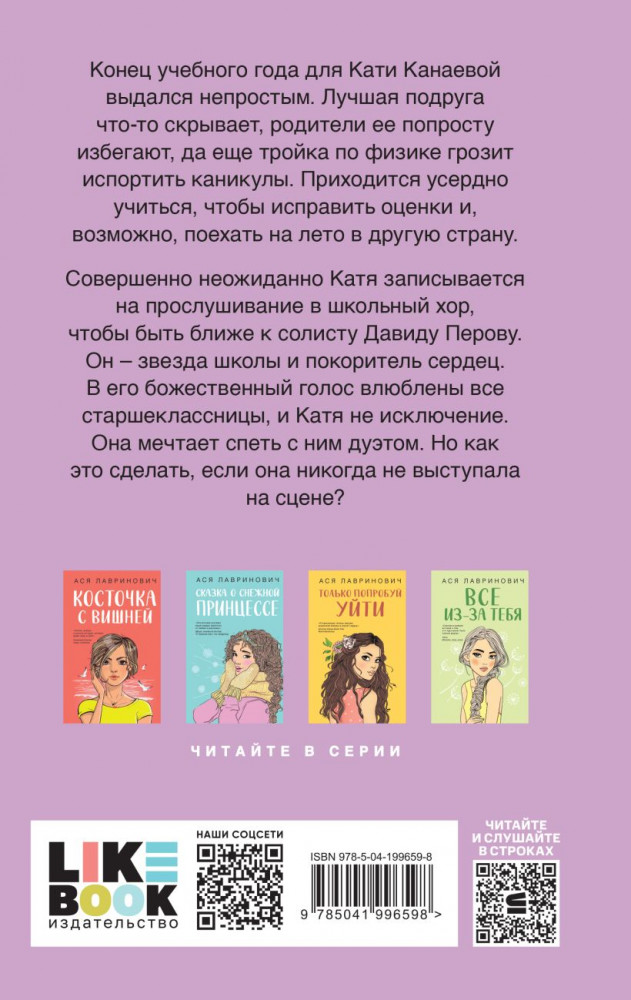 💳 Оплатить за товар можно при получении 🇰🇿 Есть бесплатная доставка по Казахстану от 1 дня 🎁 Копите бонусы с каждой покупки Серия: Young Adult. Инстахит. Романтика Конец учебного года для Кати Канаевой выдался непростым. Лучшая подруга что-то скрывает, родители ее попросту избегают, да еще тройка по физике грозит испортить каникулы. Приходится усердно учиться, чтобы исправить оценки и, возможно, поехать на лето в другую страну. Совершенно неожиданно Катя записывается на прослушивание в школьный хор, чтобы быть ближе к солисту Давиду Перову. Он — звезда школы и покоритель сердец. В его божественный голос влюблены все старшеклассницы, и Катя не исключение. Она мечтает спеть с ним дуэтом. Но как это сделать, если она никогда не выступала на сцене? |