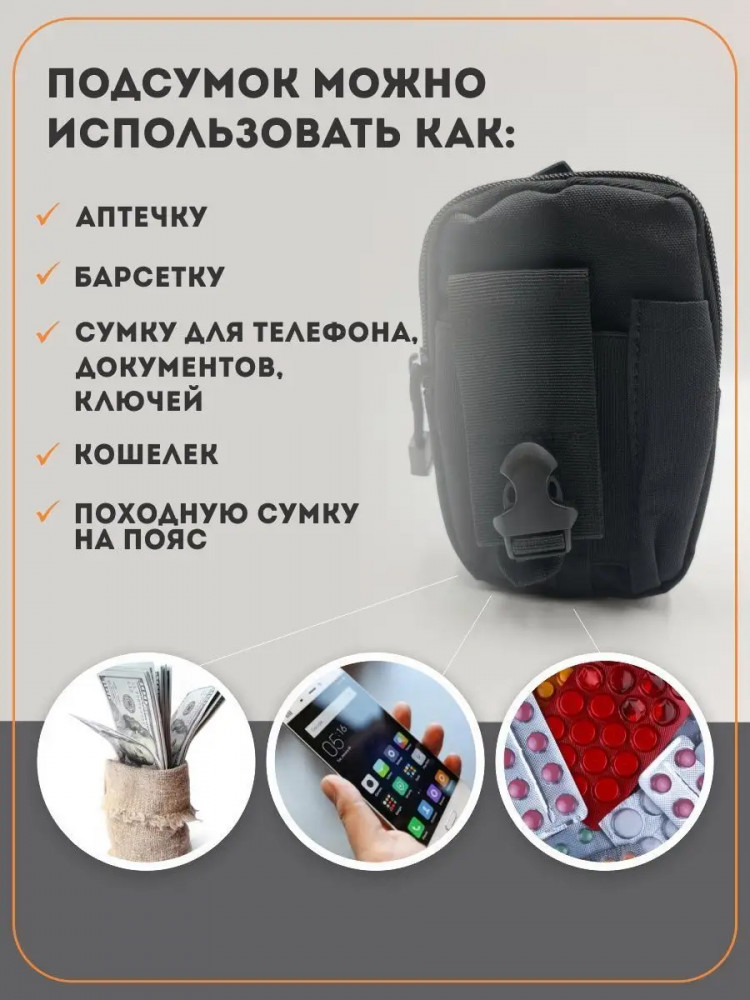 💳 Оплатить за товар можно при получении 🇰🇿 Есть бесплатная доставка по Казахстану от 1 дня 🎁 Копите бонусы с каждой покупки Универсальный практичный подсумок для охоты, рыбалки, походов и полевых выходов. Вместительный и универсальный, подходит для телефона, документов, кошелька, боеприпасов, медикаментов и тд. Есть выделенное отделение для сотового телефона, в котором ваш девайс будет надежно фиксироваться застежкой фастекс. Компактные размеры позволяют поместить подсумок на пояс, разгрузку, рюкзак и другие элементы снаряжения. |