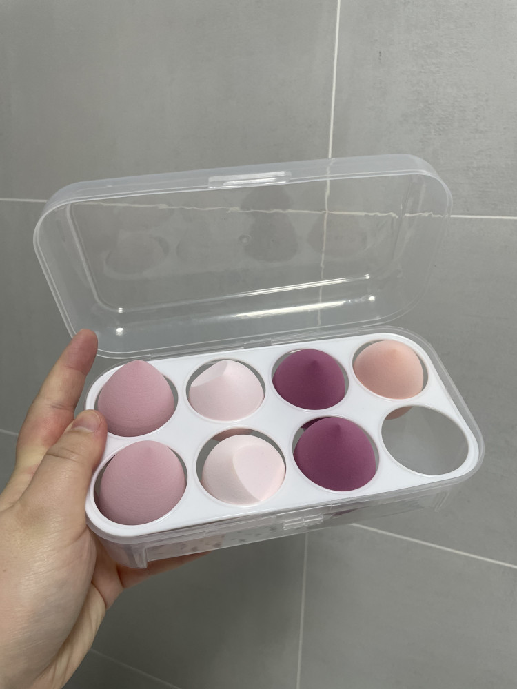 В наборе представлены 8 спонжиков разных размеров: 2 спонжа в виде капли и 6 скошенных спонжиков. Плотные, удобные и приятные на ощупь, упакованные в пластиковый небольшой футляр с ячейками для спонжиков. При контакте с водой увеличились в размере. Спасибо, Flip!