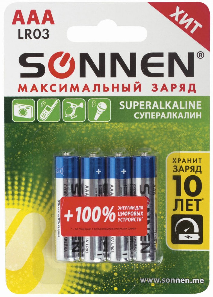 Супералкалиновые батарейки Sonnen популярного типоразмера AAA идеально подходят для приборов с высоким потреблением энергии. Рекомендуется использовать в фотовспышках, mp3-плеерах, компьютерных мышах и детских игрушках. Универсальный типоразмер AАA (мизинчиковые) — один из самых востребованных видов батареек. Используются в устройствах со средним и высоким потреблением энергии. Супералкалиновые (щелочные) батарейки рассчитаны на длительные часы работы и адаптируются к перепадам температуры, высоким нагрузкам и разряжаются равномерно, нет резкого падения мощности при потере заряда.
