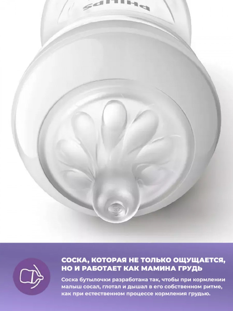 Все соски Natural Response изготовлены из мягкого силикона. 96% случаев, когда ребенок принимает соску Natural Response³. Конструкция соски позволяет избежать случайное проливание молока. Благодаря специальной конструкции соски молоко не выделяется, пока ребенок не приложит усилия, то есть подается только когда ребенок уже начал пить. Это поможет избежать проливания молока дома и на улице.