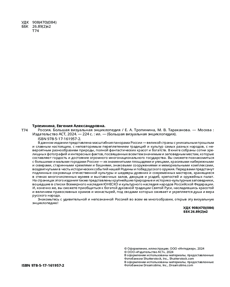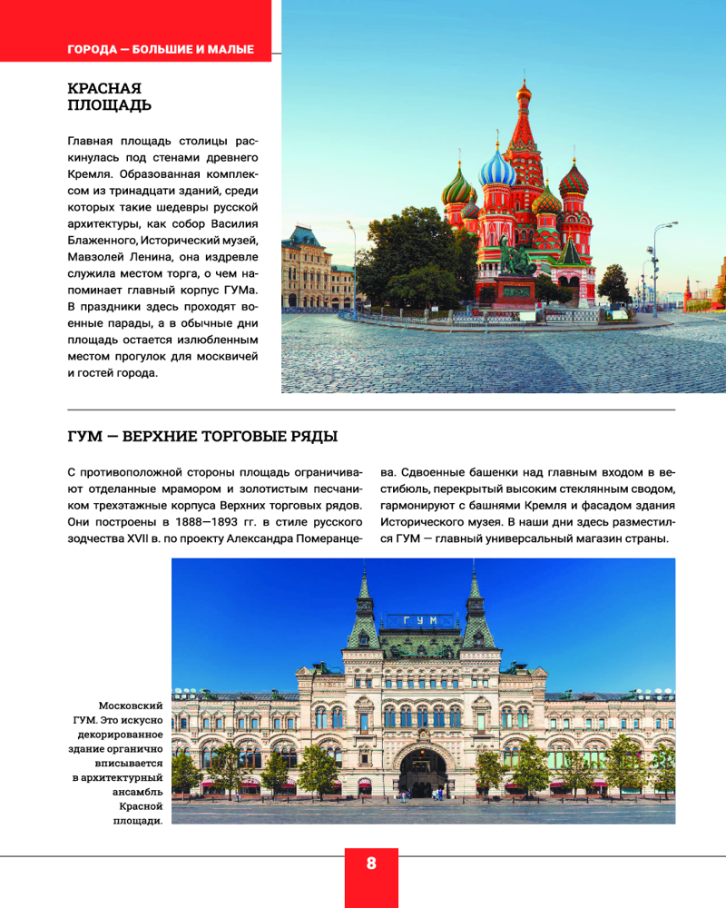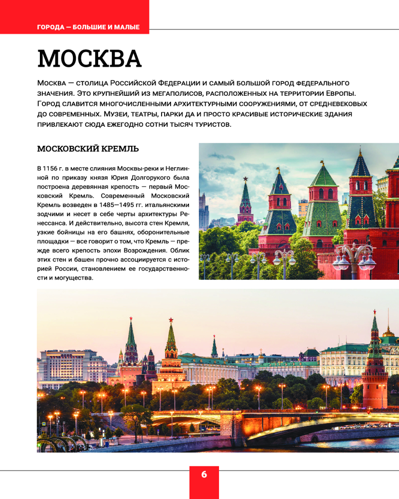 💳 Оплатить за товар можно при получении 🇰🇿 Есть бесплатная доставка по Казахстану 🎁 Копите бонусы с каждой покупки Серия: Большая визуальная энциклопедия В данном издании представлена масштабная панорама России — великой страны с уникальным прошлым и славным настоящим, с неповторимым переплетением традиций и культур самых разных народов, с невероятным разнообразием природы, полной фантастических красот и богатств. В книге собраны сотни зрелищных фотографий и интересных фактов, посвященных всем тем значимым и заповедным местам, которые составляют гордость и достояние огромного многонационального государства. Вы сможете познакомиться с большими и малыми городами России — их знаменитыми площадями и улицами, красивыми набережными и скверами, старинными кремлями и башнями, знаковыми сооружениями и мемориальными комплексами, воздвигнутыми в честь исторических событий нашей Родины и побед русского оружия. |