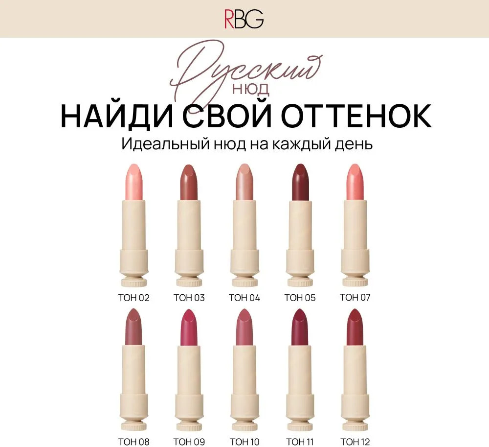 RBG Помада-бальзам для губ глянцевая «Русский нюд», тон 07 Полупрозрачный коралловый