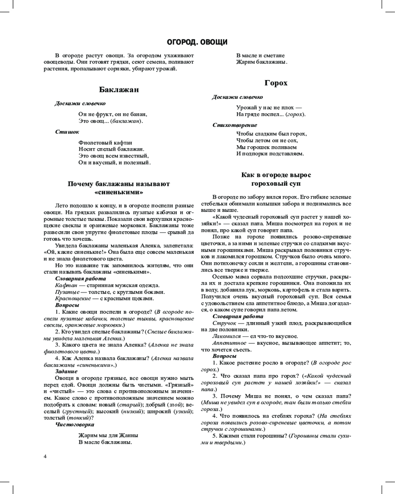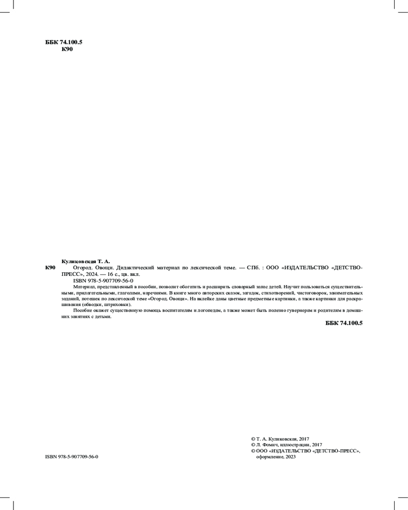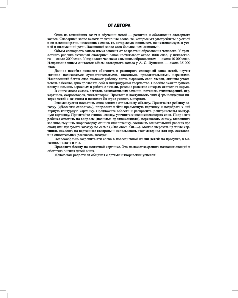 Материал, представленный в пособии, позволит обогатить и расширить словарный запас детей. Научит пользоваться существительными, прилагательными, глаголами, наречиями. В книге много авторских сказок, загадок, стихотворений, чистоговорок, занимательных заданий, потешек по лексической теме «Огород. Овощи». На вклейке даны цветные предметные картинки, а также картинки для раскрашивания (обводки, штриховки). Пособие окажет существенную помощь воспитателям и логопедам, а также может быть полезно гувернерам и родителям в домашних занятиях с детьми. |
