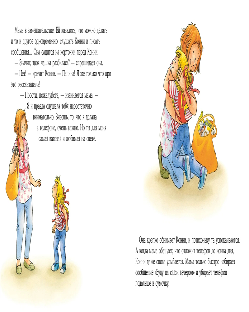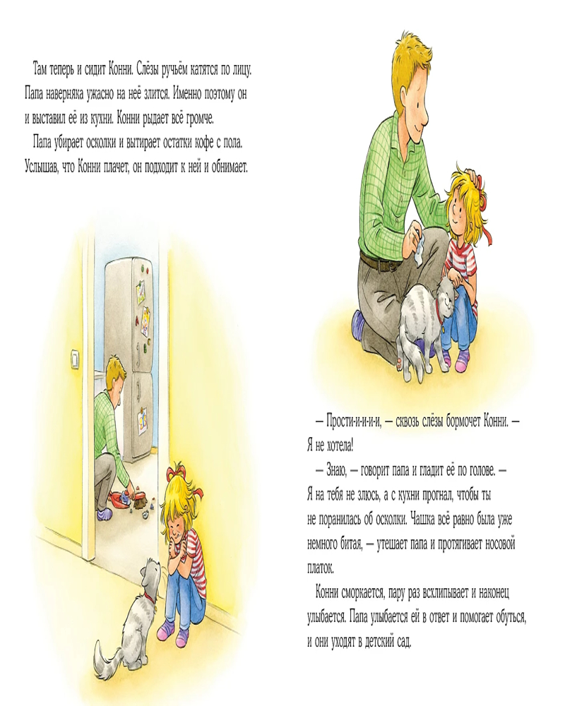 У Конни день не задался с самого утра: разбилась папина чашка, мороженое упало прямо в лужу, кот подрал любимого плюшевого мишку. Кто угодно бы расстроился в такой ситуации. Но Конни недолго унывала, потому что родители рядом и готовы были ее выслушать, утешить и помочь в решении проблемы.
