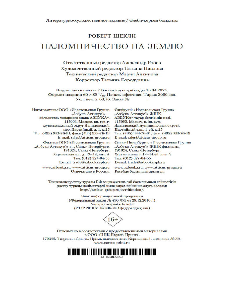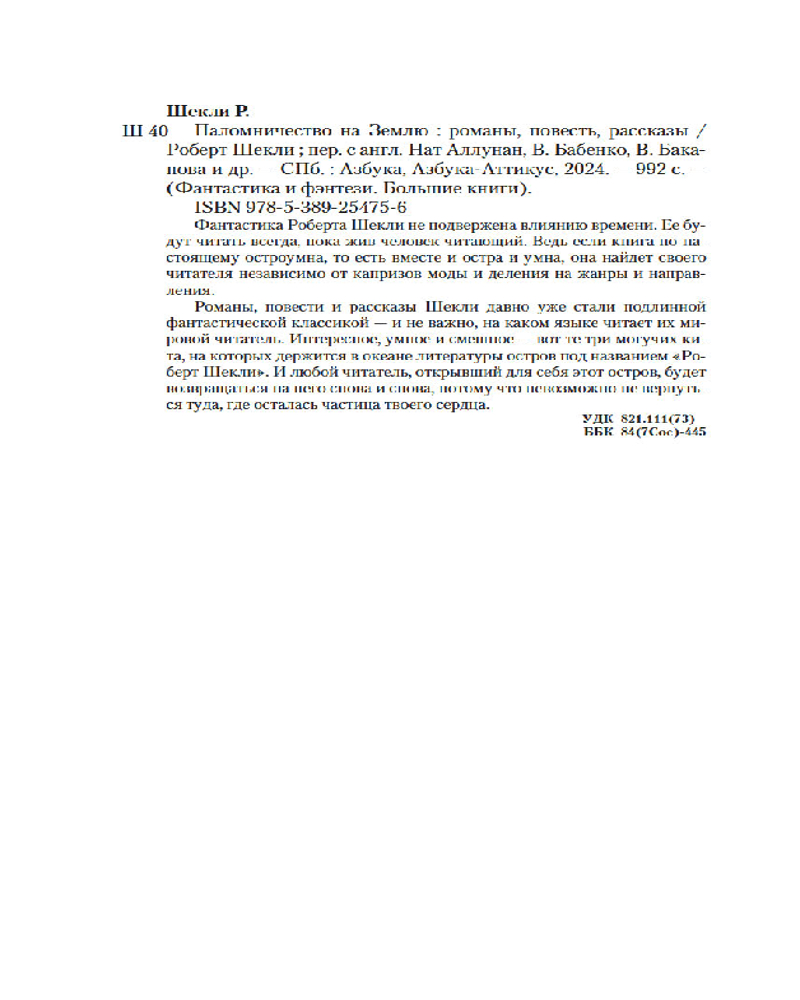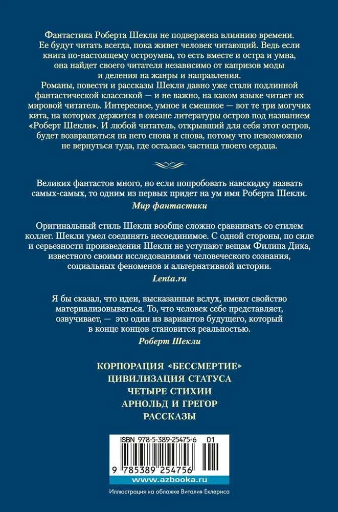 💳 Оплатить за товар можно при получении 🇰🇿 Есть бесплатная доставка по Казахстану от 1 дня 🎁 Копите бонусы с каждой покупки Серия: Фантастика и фэнтези. Большие книги Фантастика Роберта Шекли не подвержена влиянию времени. Ее будут читать всегда, пока жив человек читающий. Ведь если книга по-настоящему остроумна, то есть вместе и остра и умна, она найдет своего читателя независимо от капризов моды и деления на жанры и направления. Романы, повести и рассказы Шекли давно уже стали подлинной фантастической классикой — и не важно, на каком языке читает их мировой читатель. Интересное, умное и смешное — вот те три могучих кита, на которых держится в океане литературы остров под названием «Роберт Шекли». И любой читатель, открывший для себя этот остров, будет возвращаться на него снова и снова, потому что невозможно не вернуться туда, где осталась частица твоего сердца. |