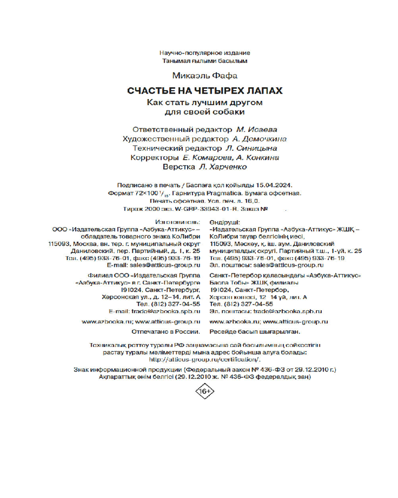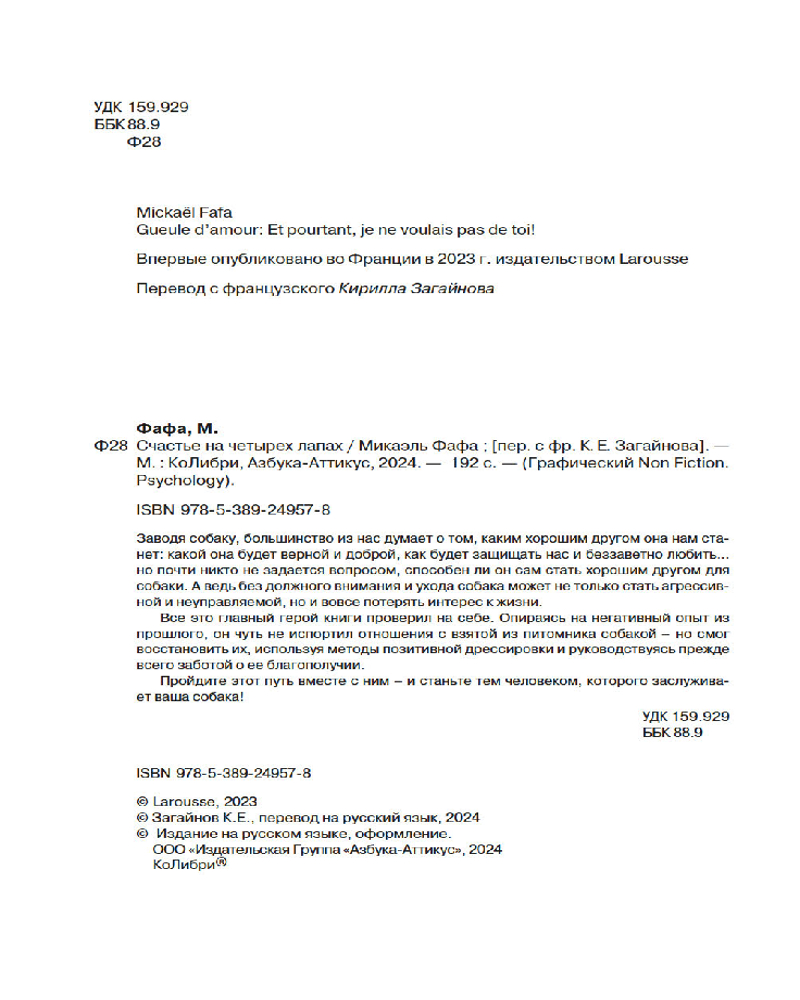 💳 Оплатить за товар можно при получении 🇰🇿 Есть бесплатная доставка по Казахстану от 1 дня 🎁 Копите бонусы с каждой покупки Серия: Графический Non Fiction. Psychology Заводя собаку, большинство из нас думает о том, каким хорошим другом она нам станет: какой она будет верной и доброй, как будет защищать нас и беззаветно любить… но почти никто не задается вопросом, способен ли и он сам стать хорошим другом для собаки. А ведь без должного внимания и ухода собака может не только стать агрессивной и неуправляемой, но и вовсе потерять интерес к жизни. Все это главный герой книги проверил на себе. Опираясь на негативный опыт из прошлого, он чуть не испортил отношения с взятой из питомника собакой — но смог восстановить их, используя методы позитивной дрессировки и руководствуясь, прежде всего, заботой о ее благополучии. Пройдите этот путь вместе с ним — и станьте тем человеком, которого заслуживает ваша собака! |