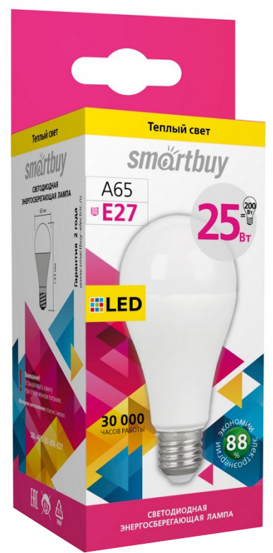 Светодиодная лампа Smartbuy SBL-A65-25-30K-E27 предназначена для общего или декоративного освещения. Она идеально подходит для замены стандартных ламп накаливания и галогенных. Эта светодиодная лампа отличается экономичностью, долгим сроком службы и экологической безопасностью. Она не содержит ртути и идеально подходит для различных светильников.
