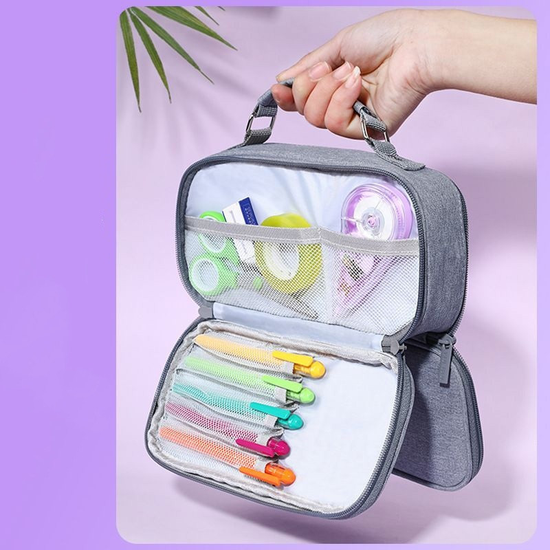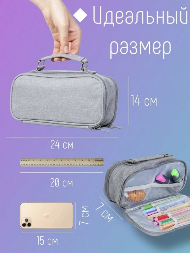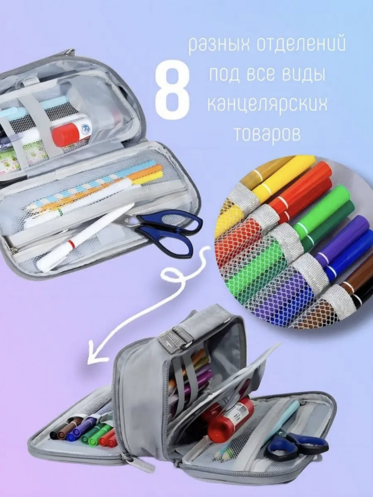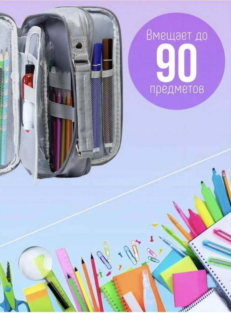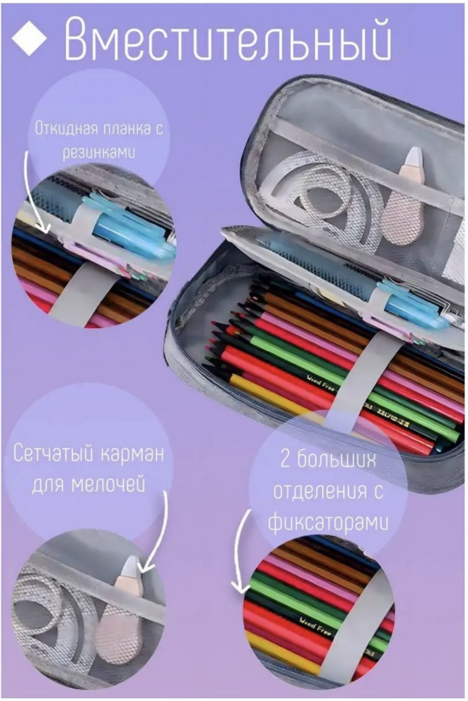 Многофункциональный пенал может использоваться, как школьный пенал, как органайзер для хранения жесткого диска и телефона, канцелярии и школьных принадлежностей. Пенал школьный для подростков состоит из одного большого отделения, где можно разместить линейки, фломастеры и другие товары для школы. В кармане из сетки на молнии можно хранить мелкие предметы: ластик, стикеры, наушники, USB-кабель, карты и прочее. |