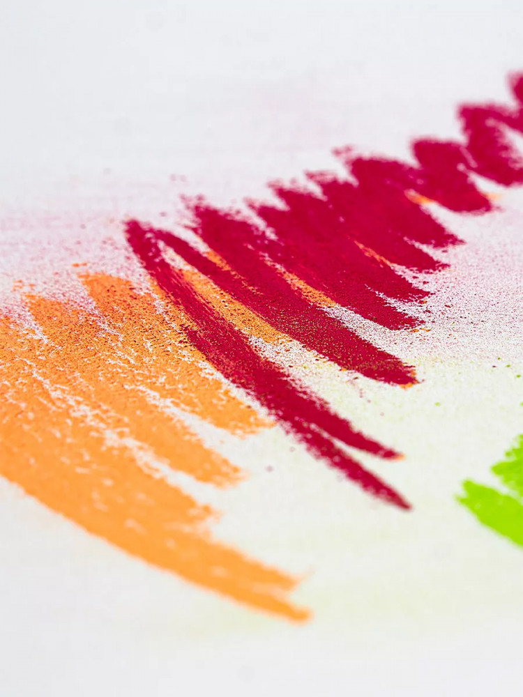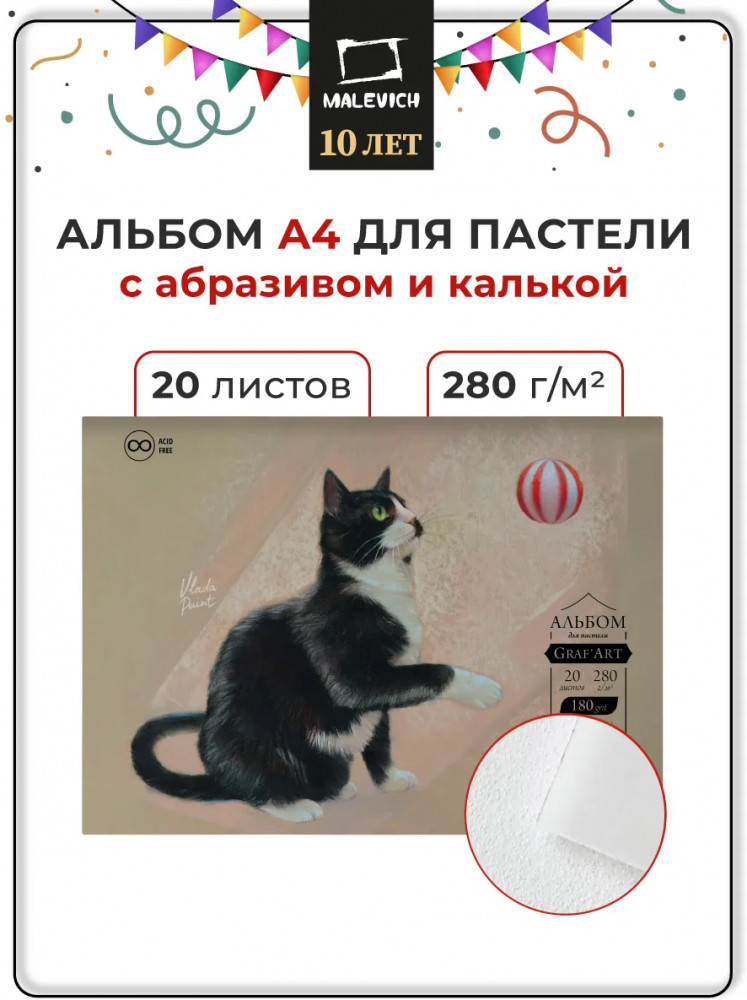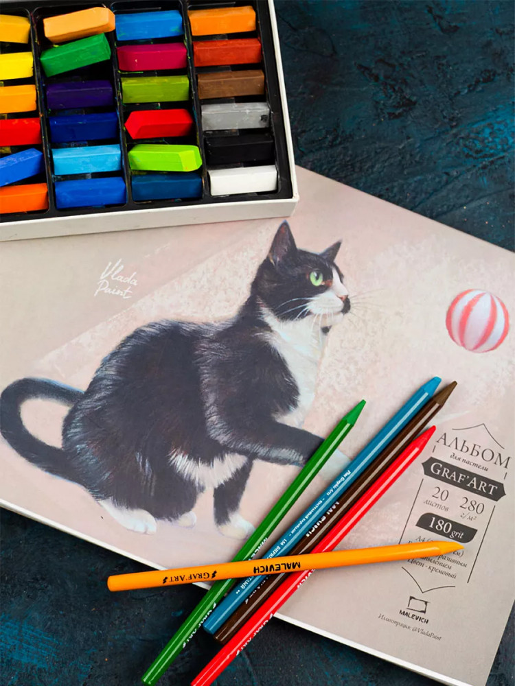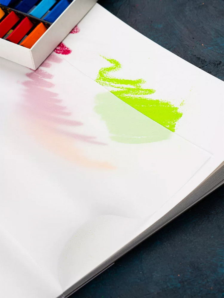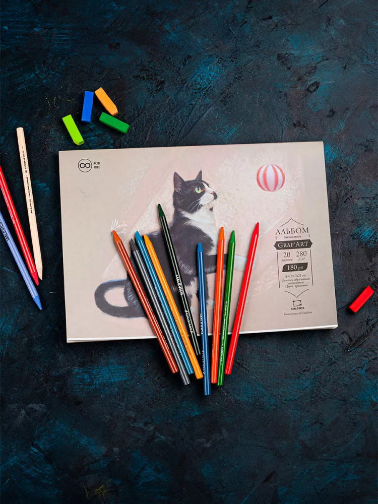 Альбом из 20 листов с напылением, имитирующим наждачную бумагу. Покрытие без кислот, а значит, цвета вашей работы не поменяются. Каждый лист разделен калькой для дополнительной защиты готовых работ. Подойдёт для всех видов сыпучих материалов: пастели, угля, графита, сангины, пастельных карандашей. Бумага принимает достаточно много слоев и хорошо удерживает пигмент на поверхности, цвета на ней выглядят ярче. Абразивное покрытие позволяет сделать точечную проработку мелких деталей. Цвет бумаги — кремовый. Можно тонировать в любой цвет. За счет плотности в 280 г/м² бумага влагостойка и позволяет легко тонировать лист тонким слоем гуаши, акварели или чернил для создания цветного фона для работы. Обязательно попробуйте на этой бумаге масляную пастель для многослойных работ.