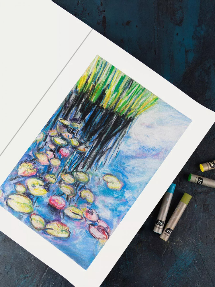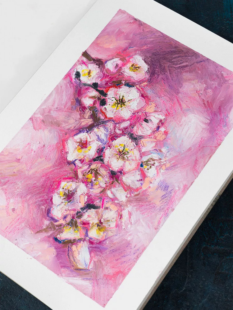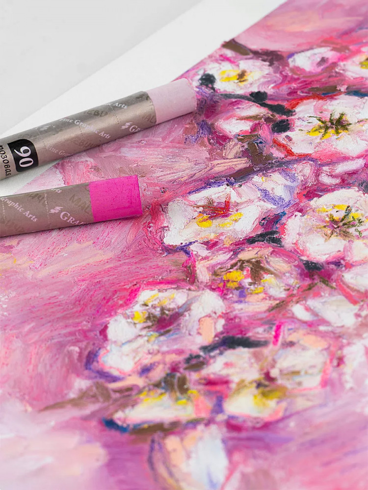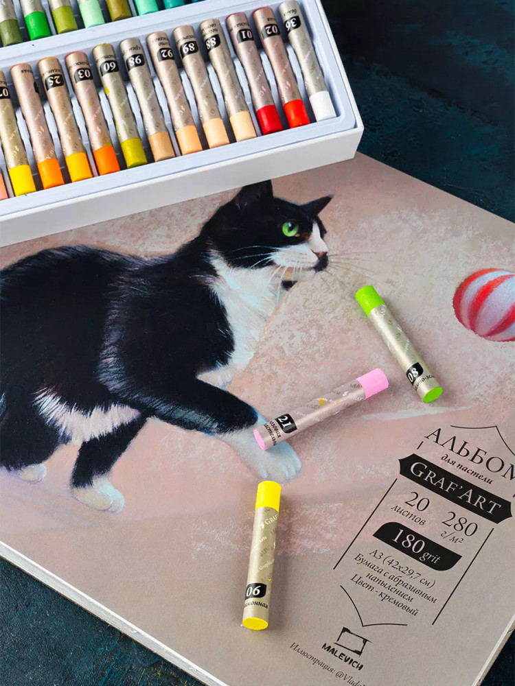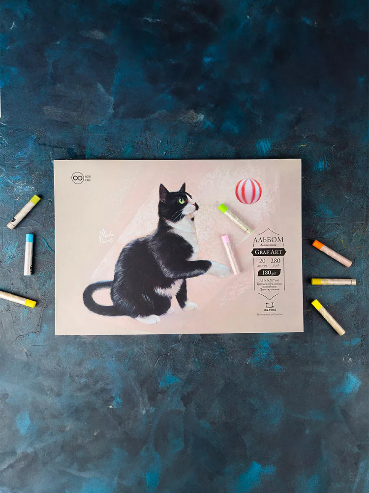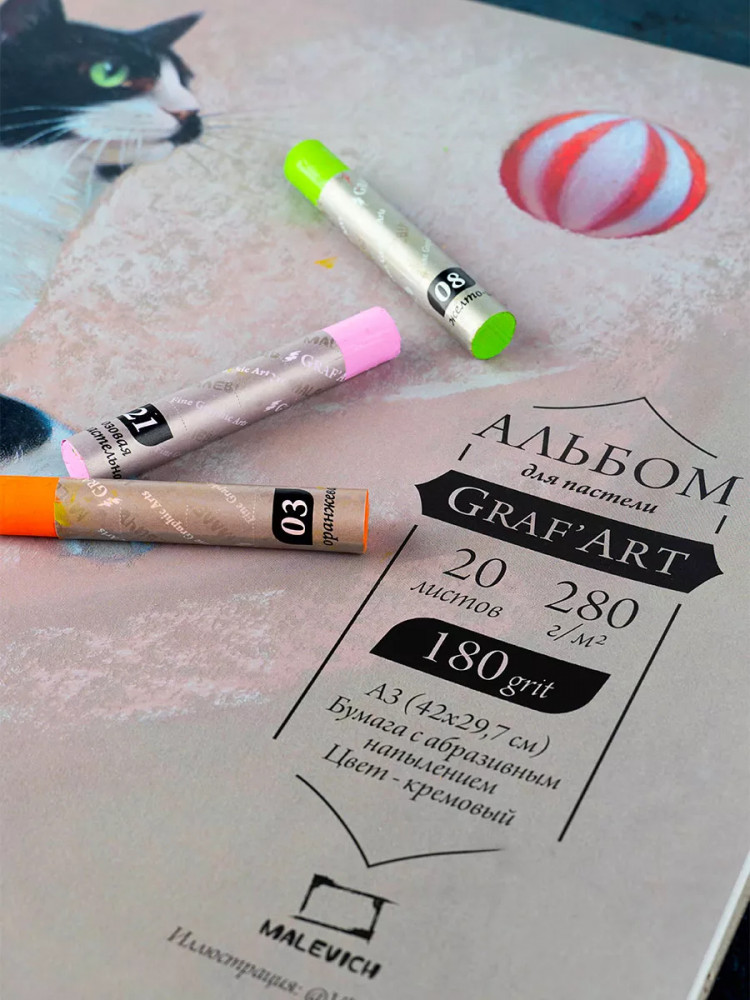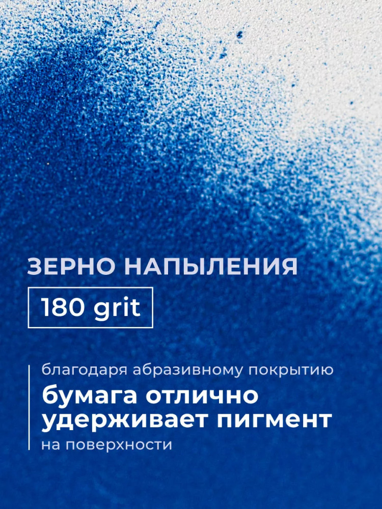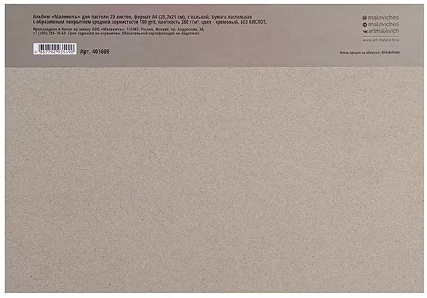 Альбом из 20 листов с напылением, имитирующим наждачную бумагу. Покрытие без кислот, а значит, цвета вашей работы не поменяются. Каждый лист разделен калькой для дополнительной защиты готовых работ. Подойдёт для всех видов сыпучих материалов: пастели, угля, графита, сангины, пастельных карандашей. Бумага принимает достаточно много слоев и хорошо удерживает пигмент на поверхности, цвета на ней выглядят ярче. Абразивное покрытие позволяет сделать точечную проработку мелких деталей. Цвет бумаги — кремовый. Можно тонировать в любой цвет. За счет плотности в 280 г/м² бумага влагостойка и позволяет легко тонировать лист тонким слоем гуаши, акварели или чернил для создания цветного фона для работы. Обязательно попробуйте на этой бумаге масляную пастель для многослойных работ.