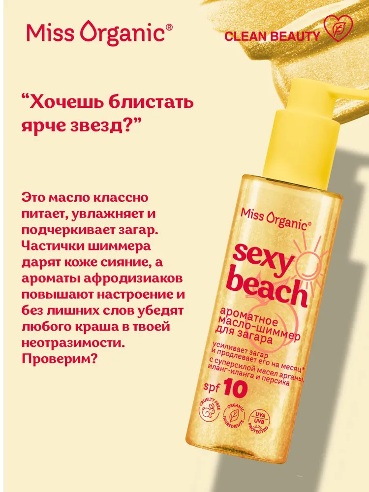Miss Organic Масло-шиммер для загара «Sexy Beach» SPF 10приятный аромат быстро впитывается деликатное мерцание увлажняет вызывает аллергию В данный момент этот товар отсутствует в продаже. Возможно, у нас найдется аналогичный или похожий товар здесь. Хочешь блистать ярче звезд? Подари своей коже соблазнительный оттенок загара и восхитительное мерцание. Это масло классно питает, увлажняет ее и подчеркивает загар, благодаря теплому маслу арганы. Частички шиммера дарят коже сияние, а ароматы афродизиаков иланг-иланга и персика повышают настроение и без лишних слов убедят любого краша в твоей неотразимости. Проверим? |