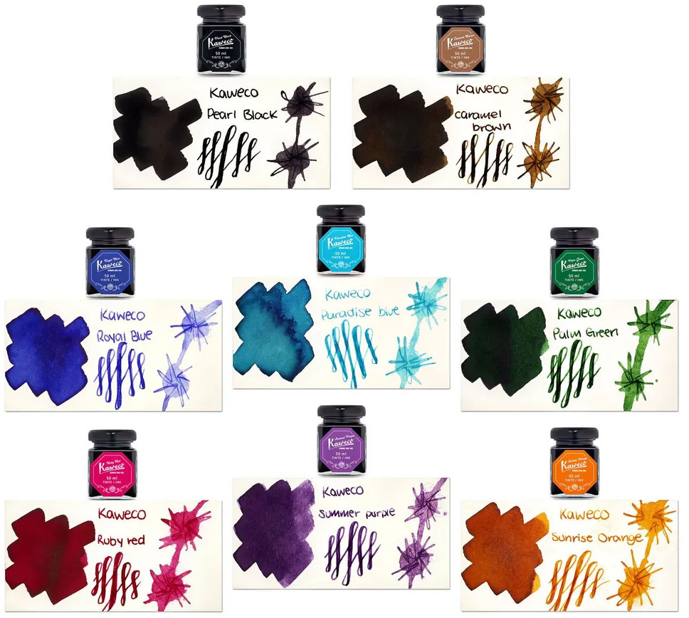Не водостойкие. Высококачественные чернила насыщенного благородного цвета дают четкие линии, не растекаются во время письма, не оставляют кляксы. Благодаря такой канцелярии Вы можете не только аккуратно писать, но и рисовать ими, т.к. чернила растворяются в воде, что позволяет Вам создавать оригинальные эскизы и узоры. Такие же чернила содержатся в картриджах Kaweco.