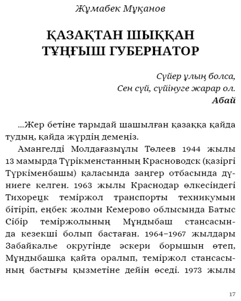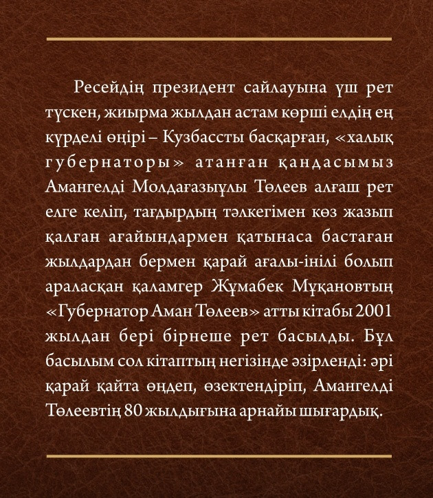 💳 Оплатить за товар можно при получении 🇰🇿 Есть бесплатная доставка по Казахстану от 1 дня 🎁 Копите бонусы с каждой покупки Серия: Прочее Ресейдің президент сайлауына үш рет түскен, жиырма жылдан астам көрші елдің ең күрделі өңірі — Кузбассты басқарған, «халық губернаторы» атанған қандасымыз Амангелді Молдағазыұлы Төлеев алғаш рет елге келіп, тағдырдың тәлкегімен көз жазып қалған ағайындармен қатынаса бастаған жылдардан бермен қарай ағалы-інілі болып араласқан қаламгер Жұмабек Мұқановтың «Губернатор Аман Төлеев» атты кітабы 2001 жылдан бері бірнеше рет басылды. Бұл басылым сол кітаптың негізінде әзірленді: әрі қарай қайта өңдеп, өзектендіріп, Амангелді Төлеевтің 80 жылдығына арнайы шығардық. |