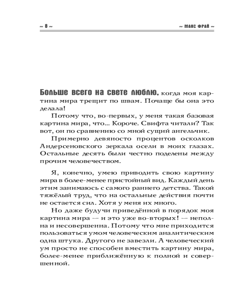 💳 Оплатить за товар можно при получении 🇰🇿 Есть бесплатная доставка по Казахстану от 1 дня 🎁 Копите бонусы с каждой покупки Серия: Миры Макса Фрая (илл. Ферез) О содержании этой книги с уверенностью можно сказать одно: Заратустра ничего подобного не говорил. Но наверняка не раз обо всём этом задумывался. Потому что вопросы всё больше простые и очевидные. Собственно, Макс Фрай всего этого тоже не говорил. Зато время от времени записывал — на бумажных салфетках в кафе, на оборотах рекламных листовок, на попонах слонов, поддерживающих земную твердь, на кучевых облаках, в собственном телефоне и на полях позавчерашних газет. Потому что иногда записать — это самый простой способ подумать и сформулировать. |