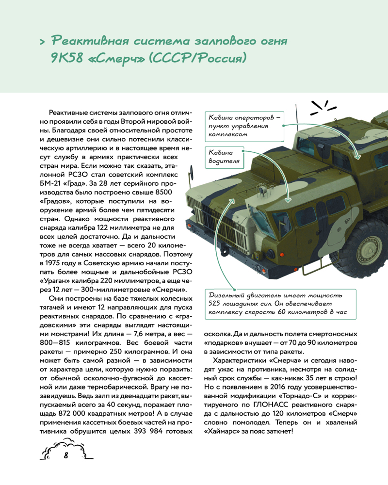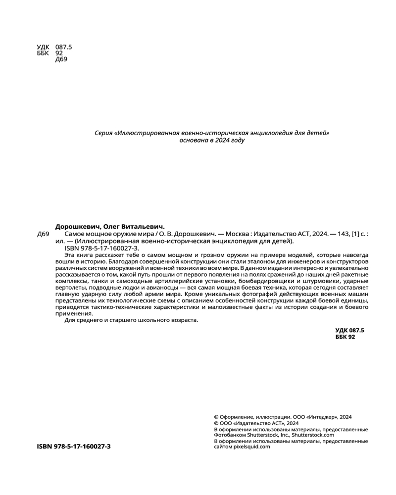 💳 Оплатить за товар можно при получении 🇰🇿 Есть бесплатная доставка по Казахстану от 1 дня 🎁 Копите бонусы с каждой покупки Серия: Иллюстрированная военно-историческая энциклопедия для детей Эта книга расскажет тебе о самом мощном и грозном оружии на примере моделей, которые навсегда вошли в историю благодаря их совершенной конструкции и стали эталонными для инженеров и конструкторов различных систем вооружений во всем мире. Как известно, всё созданное руками человека благодаря научному прогрессу имеет свойство постоянно улучшаться и модернизироваться, и в первую очередь это касается средств ведения войны. В данном издании интересно и увлекательно рассказывается о том, какой путь в своем развитии прошли от первого появления на полях сражений до наших дней ракетные комплексы, танки и самоходные артиллерийские установки, бомбардировщики и штурмовики, ударные вертолеты, подводные лодки и авианосцы — вся самая мощная боевая техника, которая сегодня составляет главную ударную силу любой армии мира. Кроме уникальных фотографий действующих военных машин представлены их технологические схемы с описанием особенностей конструкции каждой боевой единицы, приводятся тактико-технические характеристики и малоизвестные факты из истории создания и боевого применения. |