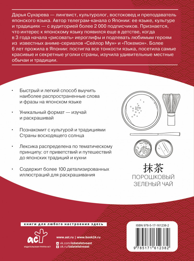 💳 Оплатить за товар можно при получении 🇰🇿 Есть бесплатная доставка по Казахстану 🎁 Копите бонусы с каждой покупки Серия: Изучаем лексику. Визуальный словарь-раскраска Дарья Сухарева — лингвист, культуролог, востоковед и преподаватель японского языка. Автор телеграмм-канала о Японии: ее языке, культуре и традициях — с аудиторией более 2 000 подписчиков. Признается, что интерес к японскому языку появился еще в детстве, когда в 3 года начала «рисовать» иероглифы и подпевать любимым героям из известных аниме-сериалов «Сейлор Мун» и «Покемон». Более 6 лет прожила в Японии: постигла все тонкости языка, посетила самые красивые и секретные уголки страны, изучила удивительные местные обычаи и традиции. |