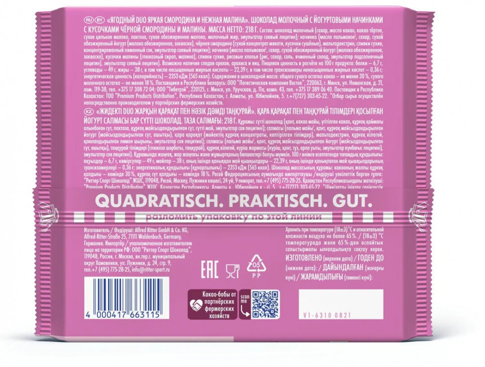 Ritter Sport Плиточный шоколад с ягодами и йогуртом «Fruity Duo»