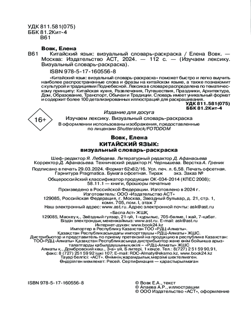💳 Оплатить за товар можно при получении 🇰🇿 Есть бесплатная доставка по Казахстану от 1 дня 🎁 Копите бонусы с каждой покупки Серия: Изучаем лексику. Визуальный словарь-раскраска Елена Вовк — преподаватель, автор курсов, блогер и основатель онлайн-школы китайского языка «Miao Xuexiao», занятия в которой построены не только на классических методиках обучения, но и альтернативных — по фильмам, комиксам и аниме. Несколько лет прожила в Пекине, где научилась не только превосходно говорить на китайском, но и мастерски есть рис палочками. Является фанатом коллекционных игрушек «Поп Март» и обожает китайский острый суп Малатан. |