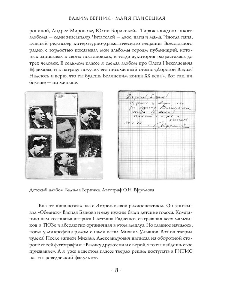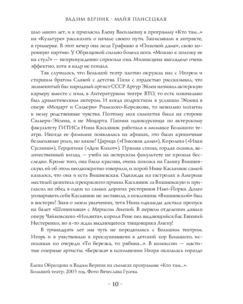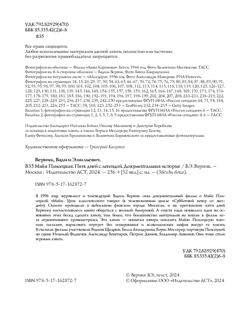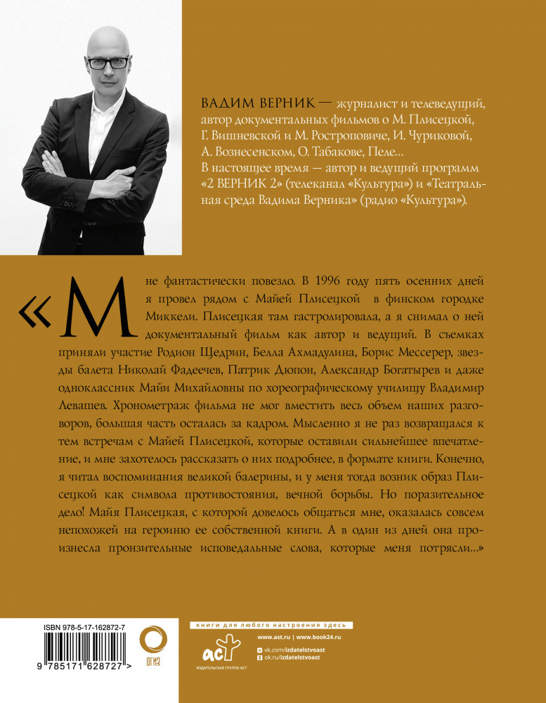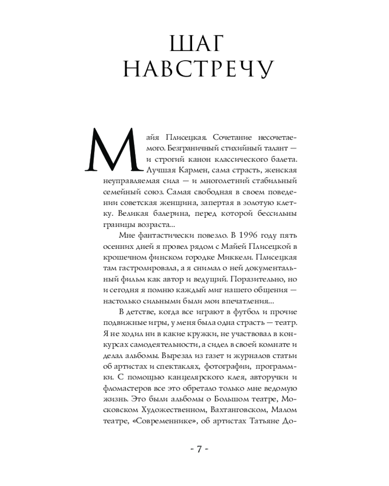Отличная книга на основе интервью В.Верника с М.М. Плисецкой. В книге есть фотографии М. Плисецкой, сделанные в разное время ее карьеры (из балетных постановок, из тренировок, во время культурных мероприятий и т.д.)