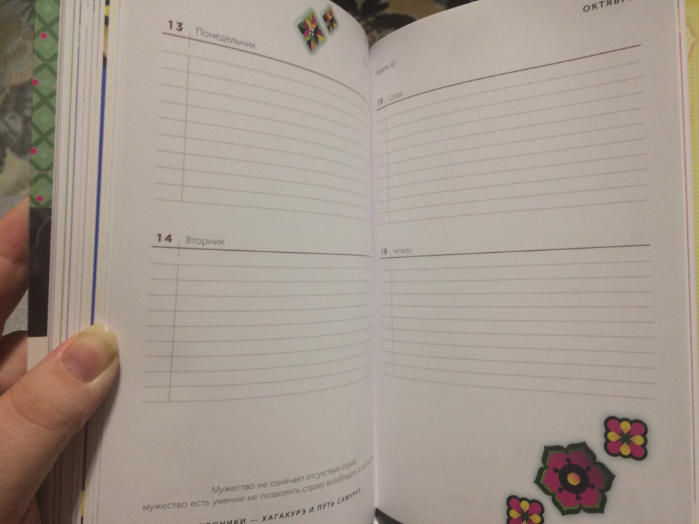 Ежедневник красивый, с цитатами на каждой странице. Плотная обложка. Единственное, что либо не было сразу указано, либо я просмотрела, что ежедневник 2014 года.