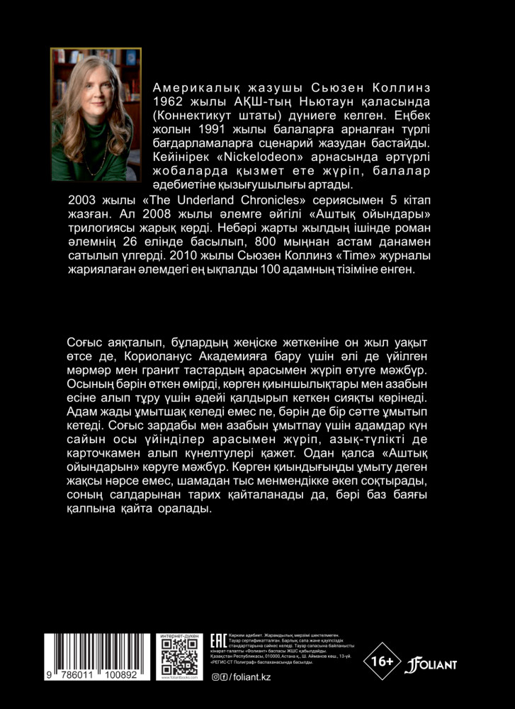 💳 Оплатить за товар можно при получении 🇰🇿 Есть бесплатная доставка по Казахстану от 1 дня 🎁 Копите бонусы с каждой покупки Серия: Үздік шетел әдебиеті Америка жазушысы Сьюзен Коллинздің «Әнші құстар мен жыландар балладасы» туындысы «Аштық ойындары» трилогиясының бастауы іспетті. Роман оқиғасы «Аштық ойындарынан» алпыс төрт жыл бұрын азамат соғысынан кейін енді ғана жандана бастаған Панемде өтеді. Бас кейіпкер, болашақ президент Кориоланус Сноу осы соғыста ата-анасынан айырылып, туған қаласының тас-талқан болған тағдырын өз көзімен көреді. «Оныншы Аштық ойындары» басталғанда Кориоланус соңғы мүмкіндігін пайдаланып, қалайда өз отбасының бұрынғы құрметі мен байлығын қайтарып алуға тырысады, сол арқылы Капитолийде мансап пен билікке қол жеткізгісі келеді. Бұл оқиға арқылы оның өмірлік жолының қалыптасуы мен ел тарихындағы ауыр кезең сипатталады. |