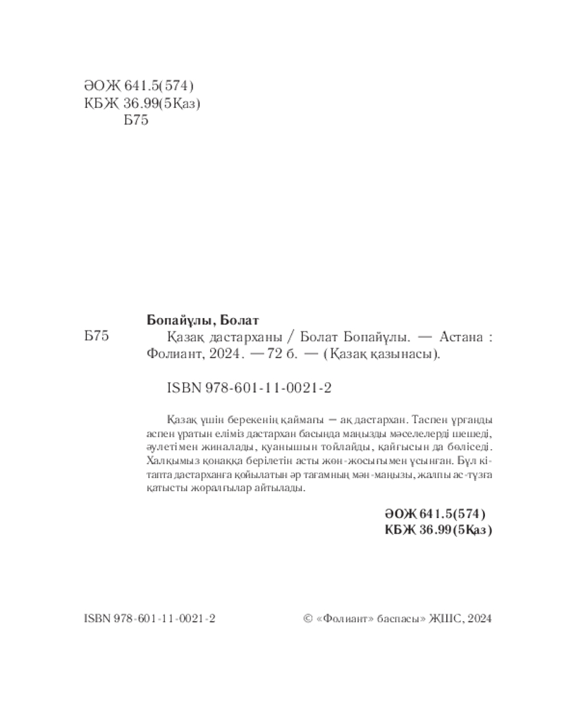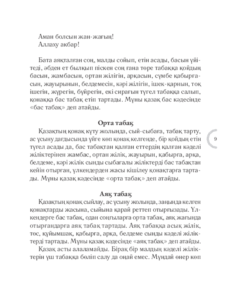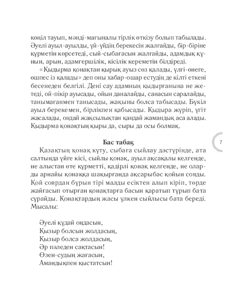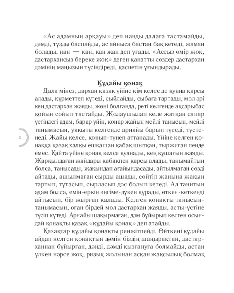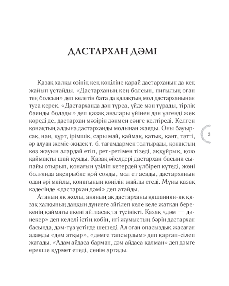 💳 Оплатить за товар можно при получении 🇰🇿 Есть бесплатная доставка по Казахстану от 1 дня 🎁 Копите бонусы с каждой покупки Серия: Қазақ қазынасы Қазақ үшін берекенің қаймағы — ақ дастархан. Таспен ұрғанды аспен ұратын еліміз дастархан басында маңызды мәселелерді шешеді, әулетімен жиналады, қуанышын тойлайды, қайғысын да бөліседі. Халқымыз қонаққа берілетін асты жөн-жосығымен ұсынған. Бұл кітапта дастарханға қойылатын әр тағамның мән-маңызы, жалпы ас-тұзғ қатысты жоралғылар айтылады. |