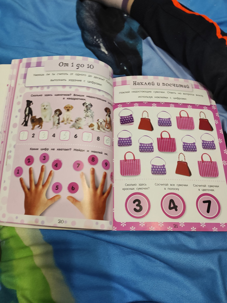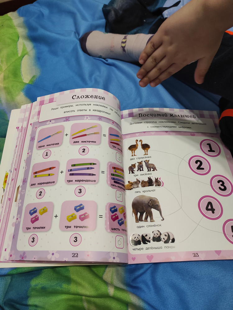 Очень красивая книга! Много развивающих заданий! Очень много наклеек и таких четких и красивых! Иллюстрации красивые, понятные и их очень много! Страницы плотные и гладкие. Редко когда встретишь такую качественную книгу для развития любимой дочки! Много разных разделов: про еду, про животных, про игрушки, про одежду и другие. Разные лабиринты, пазлы, задания на счет, на логику! Всем советую! Книга стоит потраченных денег! Пока ребенок еще не достиг 4-х лет, то можно просто по ней заниматься без наклеек, рассматривая картинки. Такая же бывает для мальчиков, только по-моему голубая книга называется.