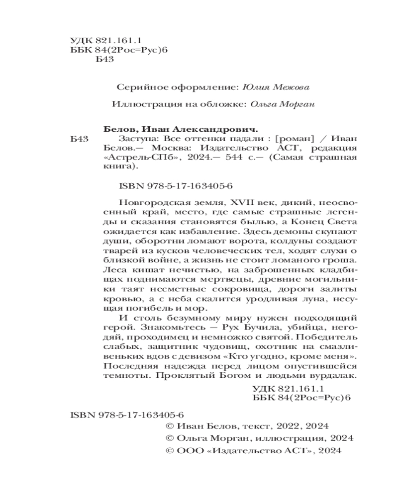 💳 Оплатить за товар можно при получении 🇰🇿 Есть бесплатная доставка по Казахстану от 1 дня 🎁 Копите бонусы с каждой покупки Серия: Самая страшная книга Новгородская земля, XVII век, дикий, неосвоенный край, место, где самые страшные легенды и сказания становятся былью, а Конец Света ожидается как избавление. Здесь демоны скупают души, оборотни ломают ворота, колдуны создают тварей из кусков человеческих тел, ходят слухи о близкой войне, а жизнь не стоит ломаного гроша. Леса кишат нечистью, на заброшенных кладбищах поднимаются мертвецы, древние могильники таят несметные сокровища, дороги залиты кровью, а с неба скалится уродливая луна, несущая погибель и мор. И столь безумному миру нужен подходящий герой. Знакомьтесь — Рух Бучила, убийца, него-дяй, проходимец и немножко святой. Победитель слабых, защитник чудовищ, охотник на смазли-веньких вдов с девизом «Кто угодно, кроме меня». Последняя надежда перед лицом опустившейся темноты. Проклятый Богом и людьми вурдалак. |