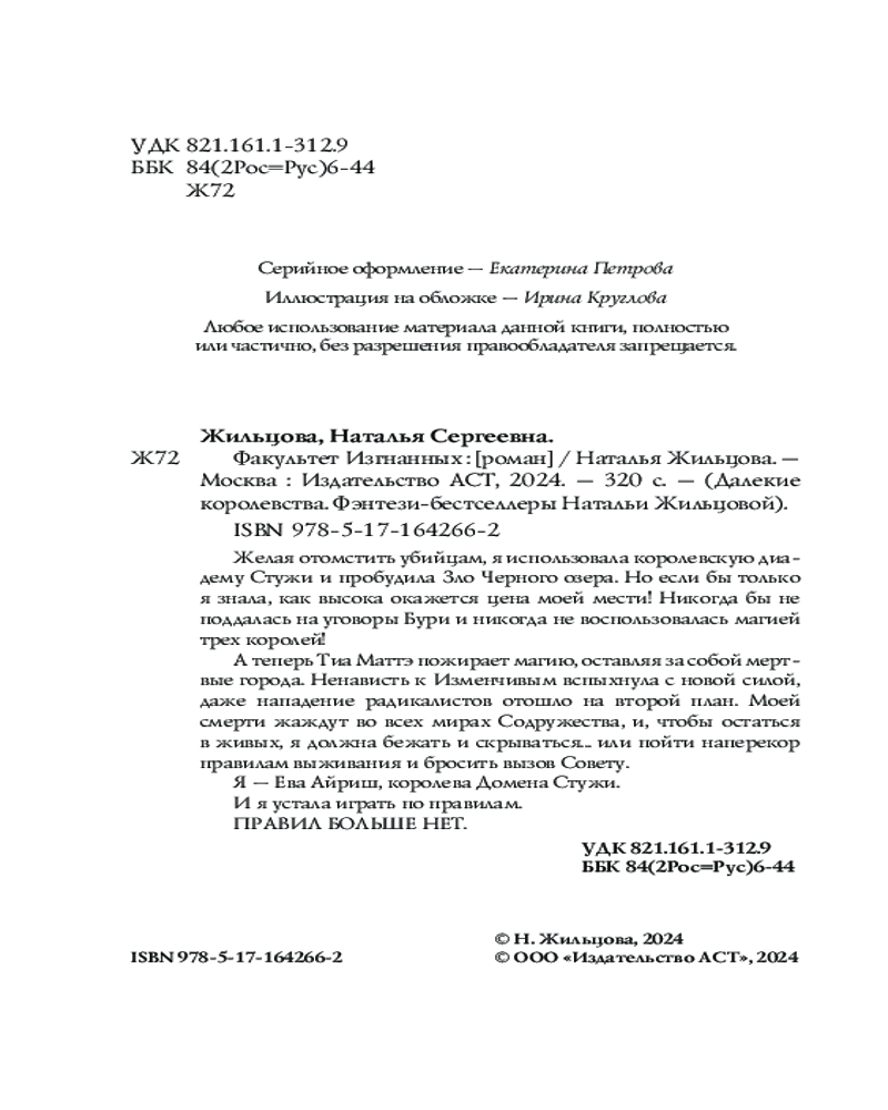 💳 Оплатить за товар можно при получении 🇰🇿 Есть бесплатная доставка по Казахстану от 1 дня 🎁 Копите бонусы с каждой покупки Серия: Далекие королевства. Фэнтези-бестселлеры Натальи Жильцовой Желая отомстить убийцам, я использовала королевскую диадему Стужи и пробудила Зло Черного озера. Но если бы только я знала, как высока окажется цена моей мести! Никогда бы не поддалась на уговоры Бури и никогда не воспользовалась магией трех королей! А теперь Тиа Маттэ пожирает магию, оставляя за собой мертвые города. Ненависть к Изменчивым вспыхнула с новой силой, даже нападение радикалистов отошло на второй план. Моей смерти жаждут во всех мирах Содружества, и чтобы остаться в живых, я должна бежать и скрываться... или пойти наперекор правилам выживания и бросить вызов Совету. Я — Ева Айриш, королева Домена Стужи. И я устала играть по правилам. Правил больше нет. |