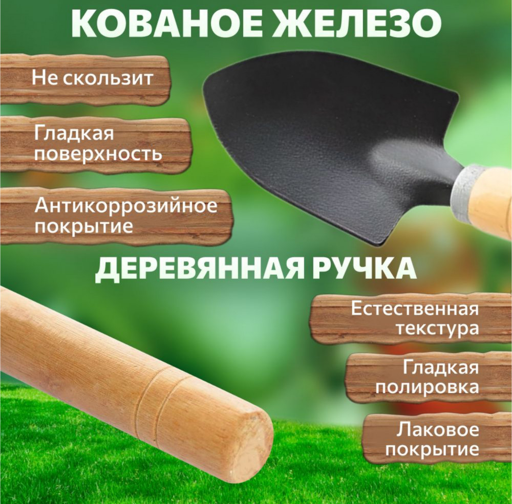 Мини набор для садовых работ выручит каждого огородника. В его состав входят грабли-разрыхлитель, помогающие подготовить почву для рассады, лопатка и совок. Посадка растений в саду станет еще быстрее и проще. Набор инструментов садовода не займет много места в сарае или у вас дома за счет своих компактных размеров. У каждой принадлежности имеется надежная деревянная ручка, обеспечивающая комфорт во время хвата. Наконечники выполнены из металла. Огород на вашей даче преобразится благодаря такому полезному инвентарю. Его также можно использовать и в домашних условиях, например, при пересадки цветов.