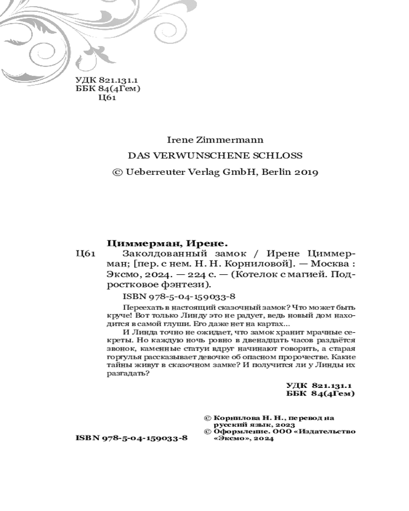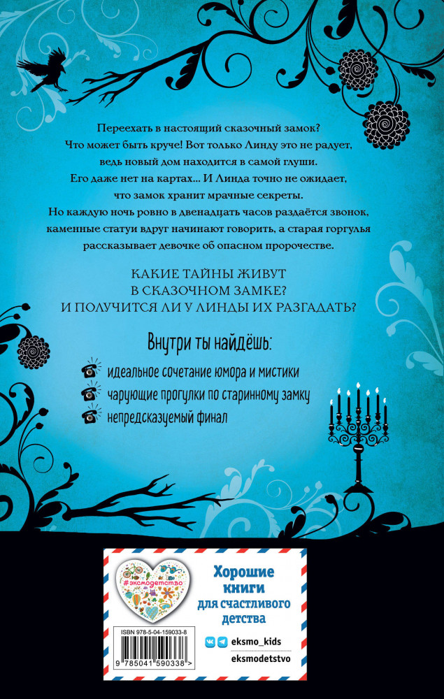 Серия: Котелок с магией. Подростковое фэнтези Новинка для подростков! Мистическая история для любителей детективных загадок с юмором и неожиданностями. Волнующая история о девочке Линде, которая переезжает в старинный замок, хранящий мрачные секреты. Каждую ночь ровно в двенадцать часов раздаётся звонок, каменные статуи вдруг начинают говорить, а старая горгулья рассказывает девочке об опасном пророчестве. Какие тайны живут в сказочном замке? И получится ли у Линды их разгадать? |
