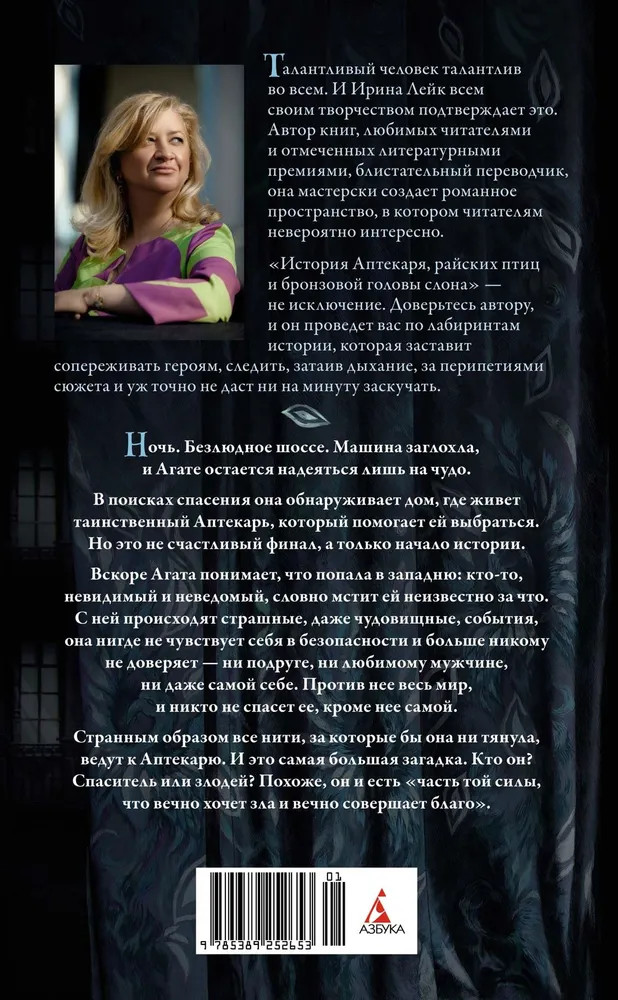 💳 Оплатить за товар можно при получении 🇰🇿 Есть бесплатная доставка по Казахстану от 1 дня 🎁 Копите бонусы с каждой покупки Талантливый человек талантлив во всем. И Ирина Лейк всем своим творчеством подтверждает это. Автор книг, любимых читателями и отмеченных литературными премиями, блистательный переводчик, она мастерски создает романное пространство, в котором читателям невероятно интересно. «История Аптекаря, райских птиц и бронзовой головы слона» — не исключение. Доверьтесь автору, и он проведет вас по лабиринтам истории, которая заставит сопереживать героям, следить, затаив дыхание, за перипетиями сюжета и уж точно не даст ни на минуту заскучать. Ночь. Безлюдное шоссе. Машина заглохла, и Агате остается надеяться лишь на чудо. В поисках спасения она обнаруживает дом, где живет таинственный Аптекарь, который помогает ей выбраться. Но это не счастливый финал, а только начало истории. Вскоре Агата понимает, что попала в западню: кто-то, невидимый и неведомый, словно мстит ей неизвестно за что. |