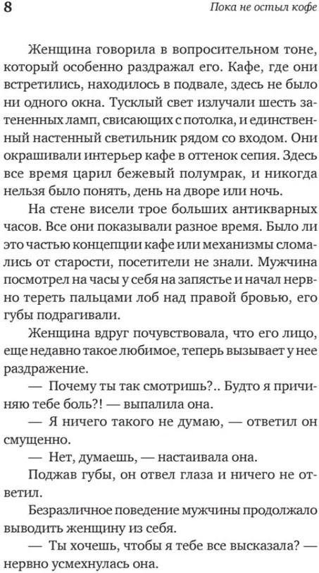 Книга уютная она рассказывает про кофейню где можно вернутся в прошлое у каждого своя причина.Читается легко самое то чтобы отдохнуть как раз мне надо было такое. Рекомендую если хотите отдохнуть с книгой 10/10 кофейных чашек