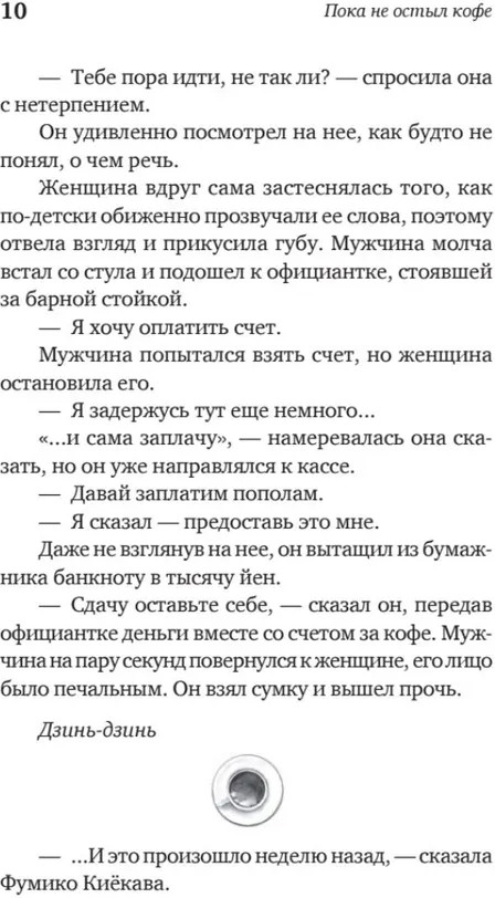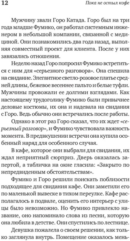 Вы когда-нибудь хотели вернуться в прошлое? Чтобы подобрать другие слова для важного разговора? Чтобы принять верное решение? Чтобы просто побыть с дорогим человеком? Городская легенда гласит: в одном японском кафе посетителям дарят такую возможность. Однако следует соблюдать пять обязательных правил. Главные из них — что бы вы ни сделали в прошлом, настоящее не изменится, вы должны успеть вернуться, пока не остыл ваш кофе. |