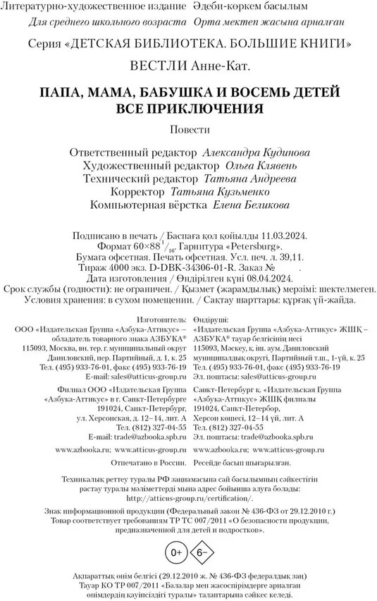 💳 Оплатить за товар можно при получении 🇰🇿 Есть бесплатная доставка по Казахстану 🎁 Копите бонусы с каждой покупки Серия: Детская библиотека. Большие книги Анне-Кат. Вестли — известная писательница, которую ласково называют Бабушкой всех норвежских детей. Это неудивительно, ведь её произведения уже несколько десятков лет дарят читателям море смеха и радости, погружают в атмосферу семейного тепла и любви, а также показывают, насколько важна забота и поддержка со стороны близких. Жизнь в большой семье — всегда приключение. А что, если в этой семье живёт восемь детей, да ещё и в одной комнате? Здесь точно не обойтись без забавных повседневных ситуаций, совместных захватывающих историй и мудрых уроков! |